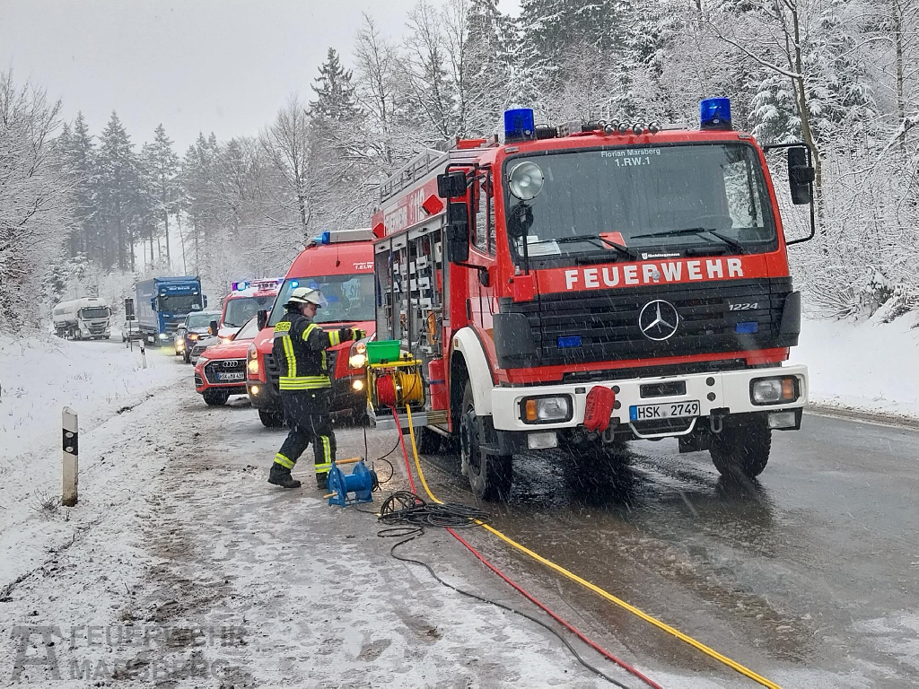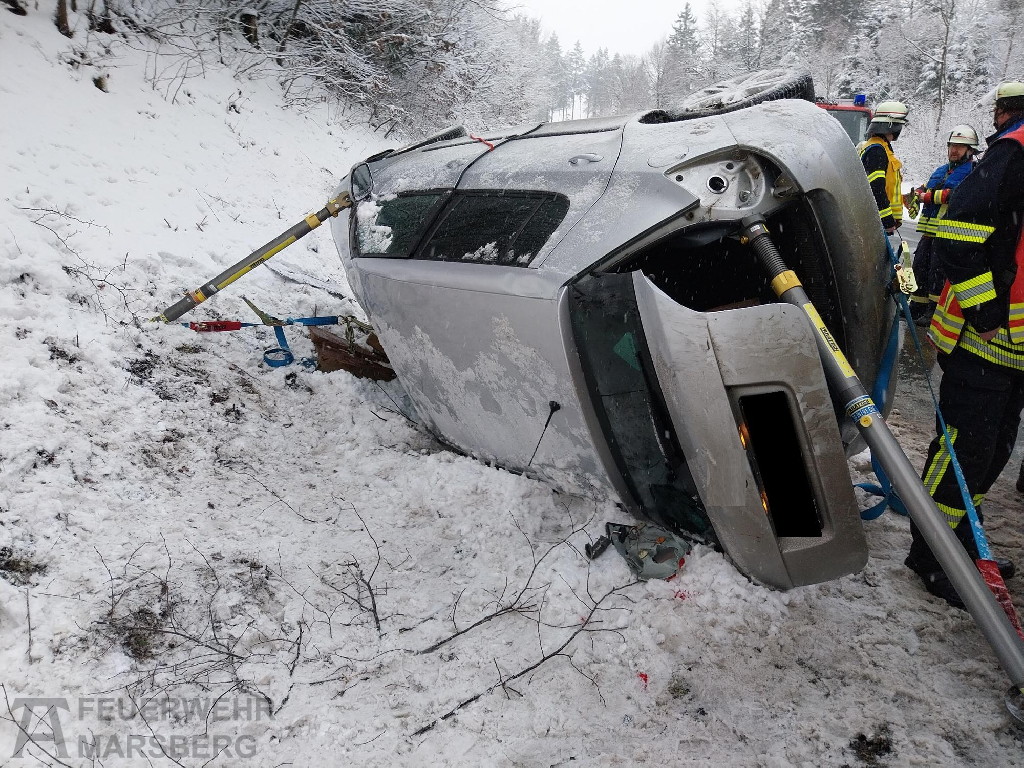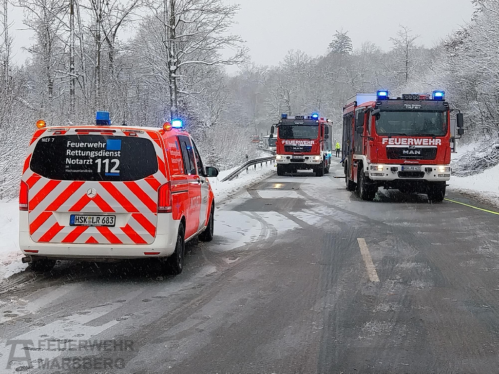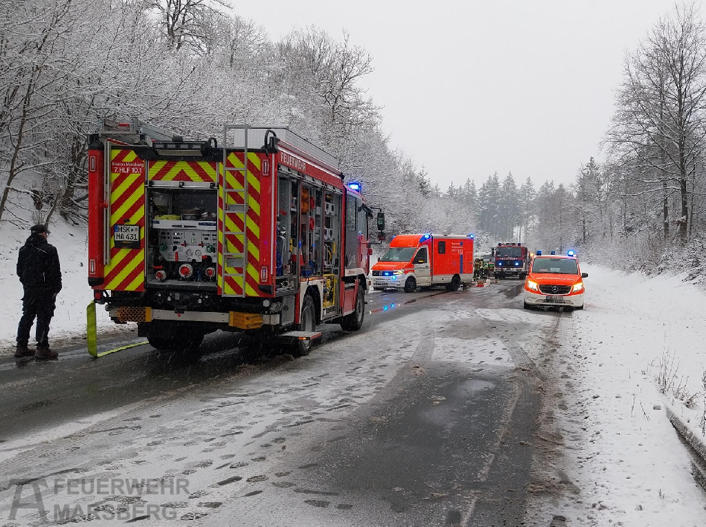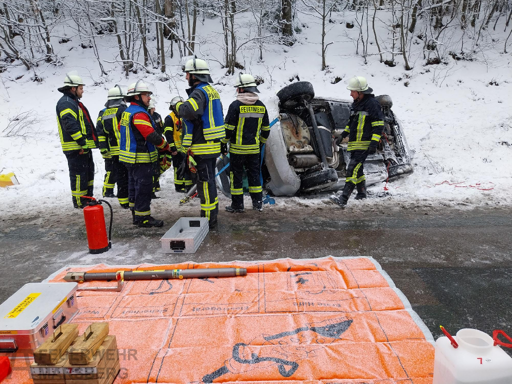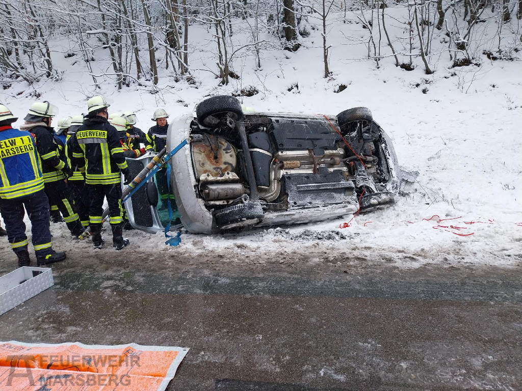 Bredelar: Zu einem Verkehrsunfall auf der B7 zwischen Bredelar und Marsberg rückten am Nachmittag des 29.1.2026 Feuerwehr, Rettungsdienst und Polizei aus: Auf spiegelglatter Fahrbahn kam ein PKW von der Straße ab und überschlug sich. Der Fahrer wurde zum Glück nur leicht verletzt. Widrige Straßenverhältnisse aufgrund von Glatteis erschwerten die Anfahrt der Einsatzkräfte.
