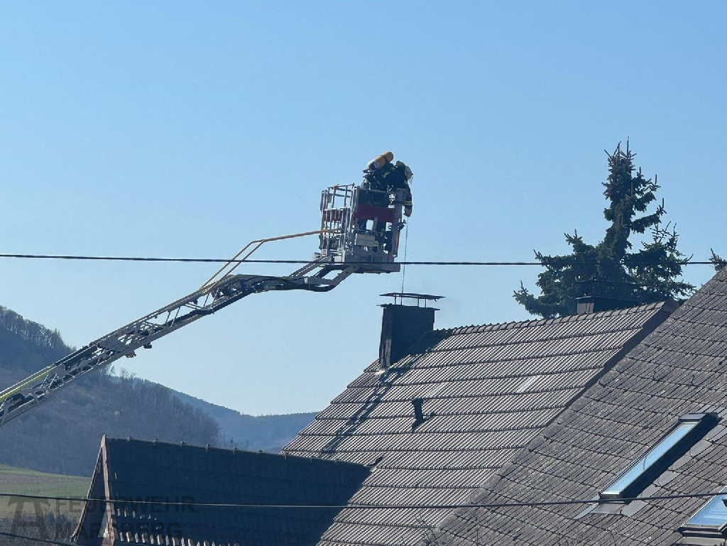 Es stellte sich heraus, dass der obere Bereich des Kamins betroffen war, auch die Kaminabdeckung hatte bereits Feuer gefangen. Aus der Drehleiter heraus musste der Kamin unter Atemschutz mehrmals gekehrt werden. Das Brandgut wurde ins Freie gebracht und dort abgelöscht. Als der Kamin soweit gesichert war, konnte der ebenfalls alarmierte Bezirksschornsteinfeger den Kamin abschließend kontrollieren. Mit einem Hochdrucklüfter wurde zudem das Innere des Gebäudes belüftet.