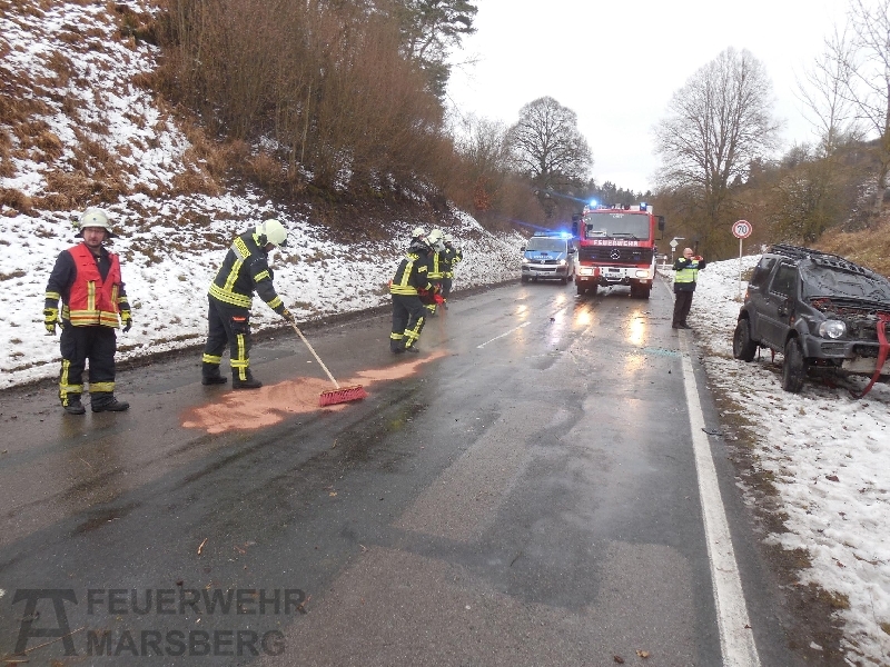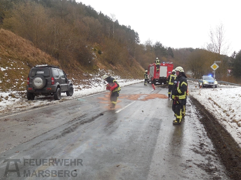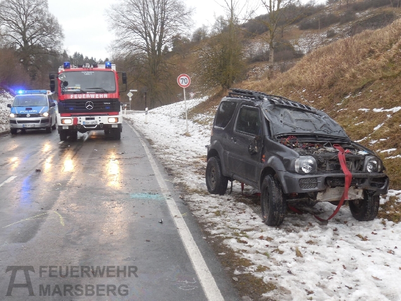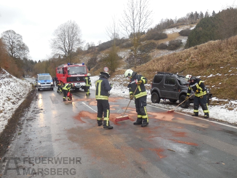 Auf der L549 in Richtung Leitmar verunglückte aus noch ungeklärter Ursache ein PKW. Der Fahrer war auf einem Feldweg (Abzweig Frohntal) unterwegs, als er aus ungeklärter Ursache von der Fahrbahn abkam. Der Wagen stürzte eine Böschung herunter, überschlug sich und kam auf der Landtraße zum Stehen.