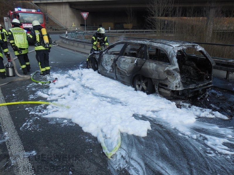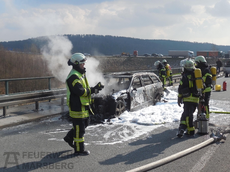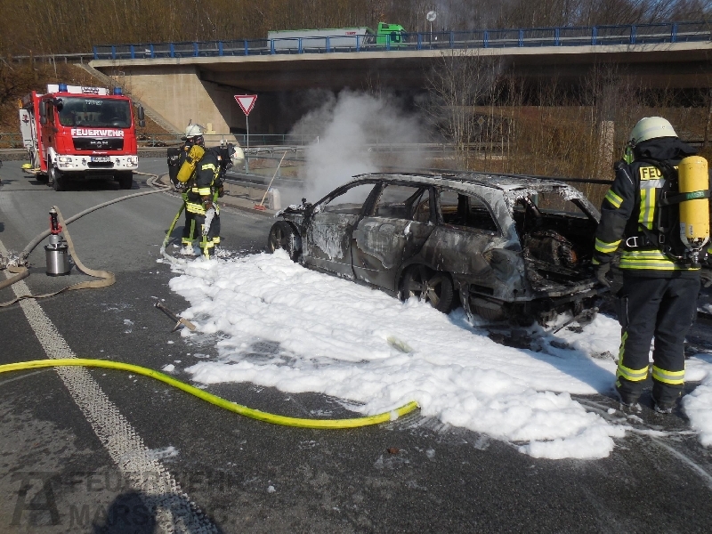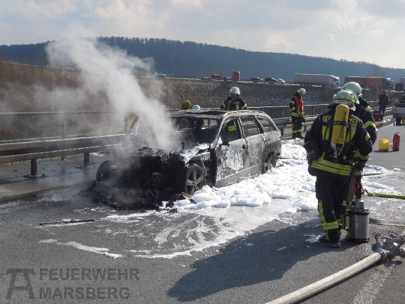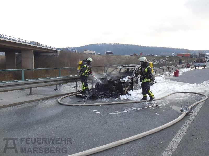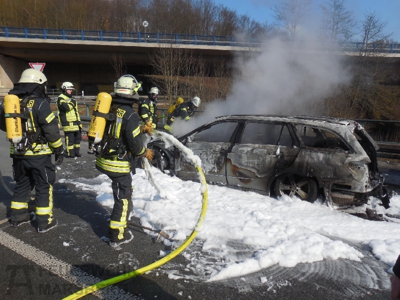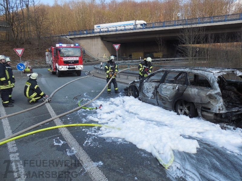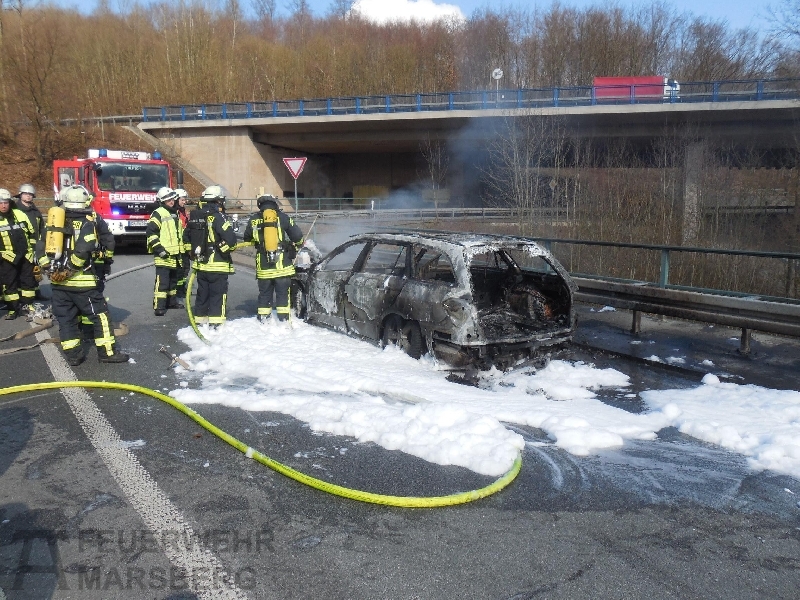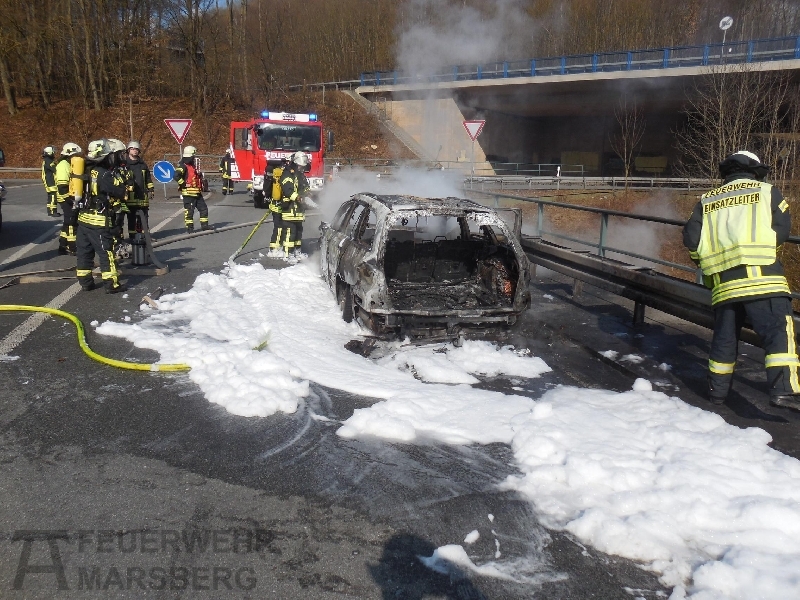 Westheim: Zu einem Brandeinsatz zwischen Westheim und Scherfede mussten in der Mittagszeit die Feuewehren aus Westheim, Oesdorf und Marsberg ausrücken. Ein PKW war an der Anschlussstelle der Autobahn A44 zur B7 (FR Kassel) in Brand geraten.