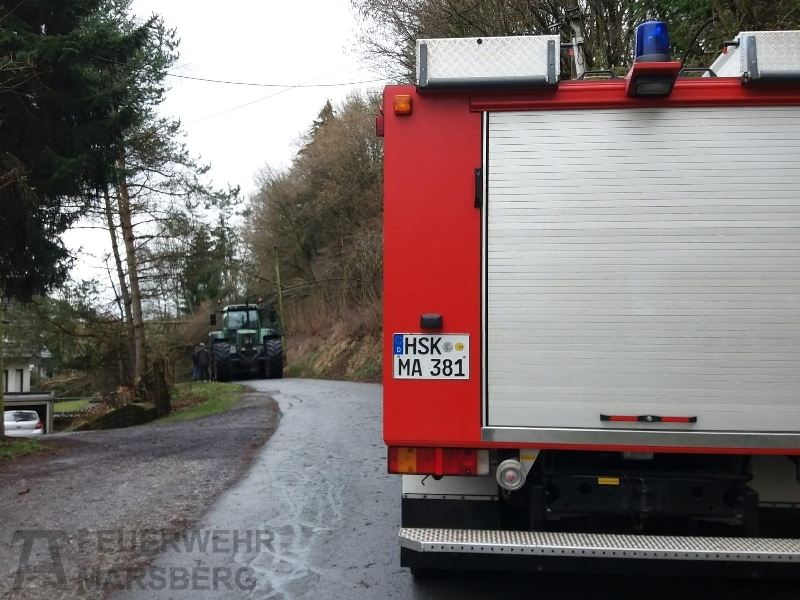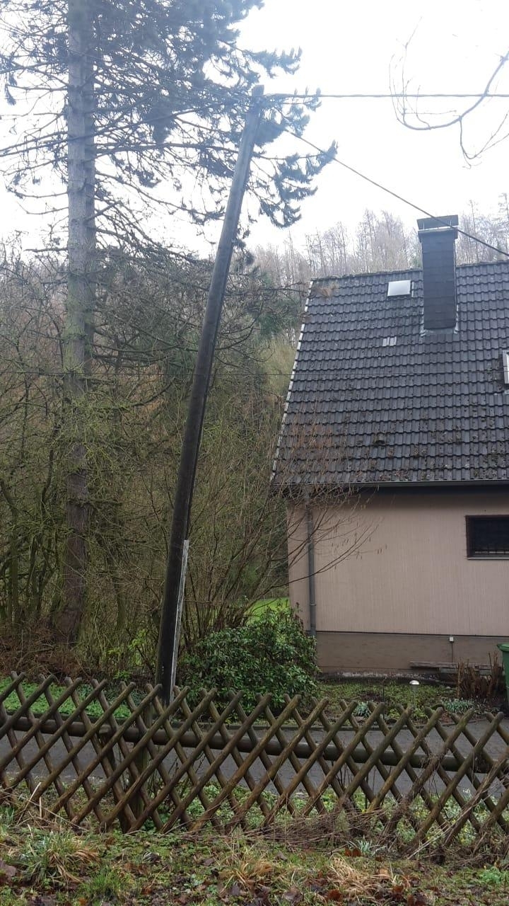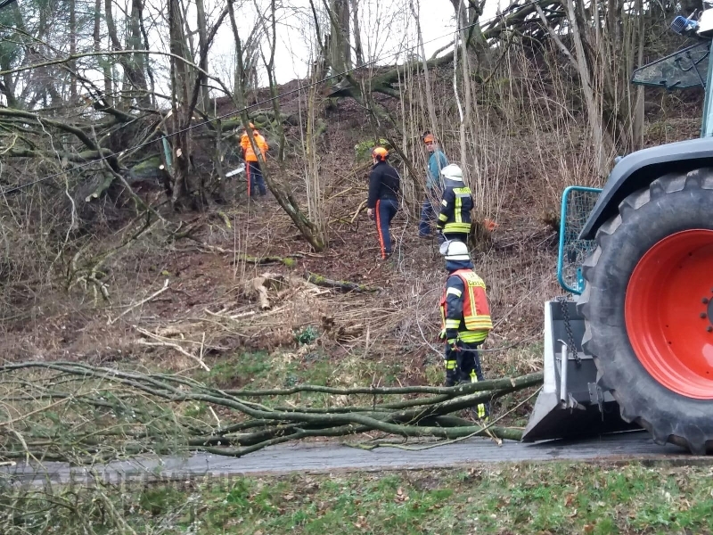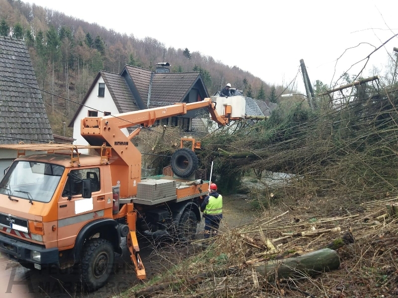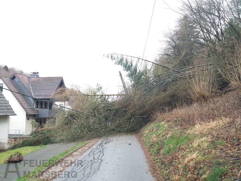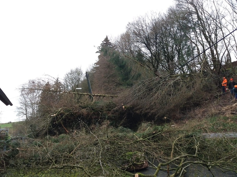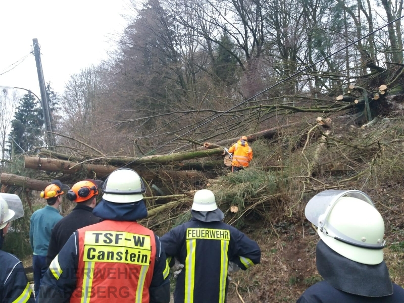 Gegen 11.00 wurde die Löschgruppe Canstein zur Kleppwiese alarmiert; gemeldet wurde den Einsatzkräften „Baum auf Fahrbahn“. An der Einsatzstelle angegroffen zeigte sich aber, dass es sich um mehrere umgestürzte Bäume handelte. Diese waren von einem Hang auf die Straße gestürzt und hatten auch eine Stromleitung in Mitleidenschaft gezogen: Zwar war die Stromleitung nicht gerissen, die Leitung stand aufgrund der Baumlast unter starkem Zug. Mehrere Strommasten drohten umzustürzen, ein Strommast war sogar teilweise aus dem Erdreich gezogen worden.