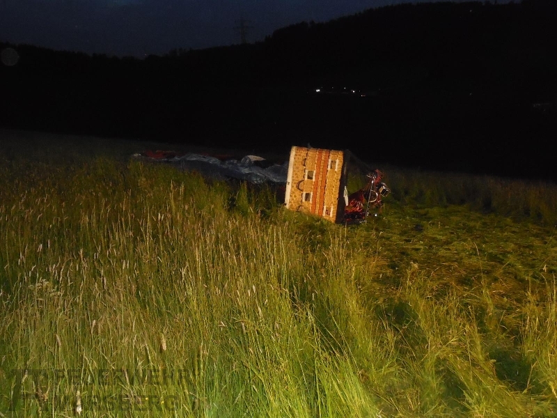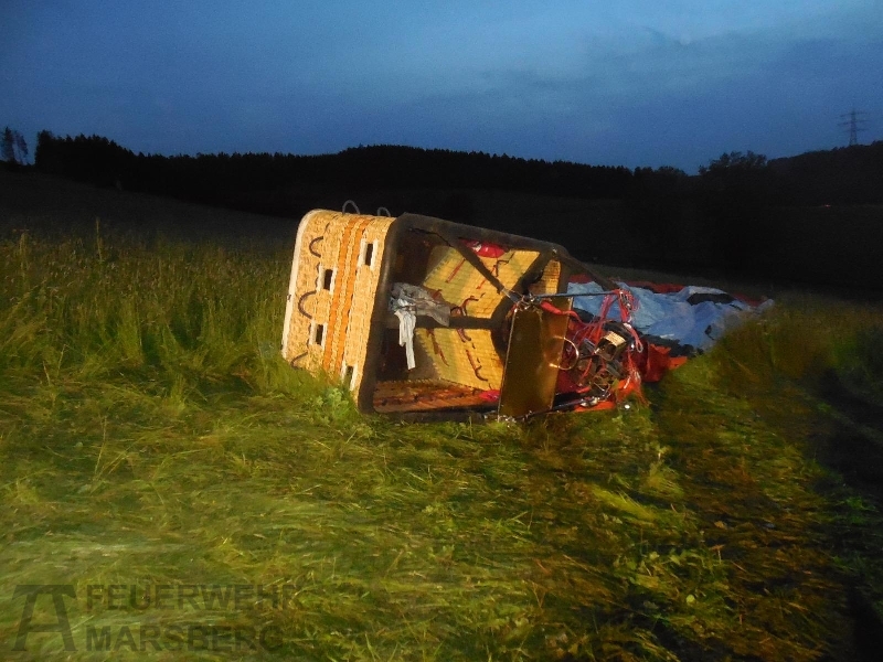 Bredelar: Ein schwerer Unfall mit einem Heißluftballon ereignete sich am Abend des 4.6.2019 zwischen in Nähe der Fettküche bei Bredelar: Auf einer Bergkuppe verunfallte ein Heißluftballon vermutlich während des Landevorgangs und überschlug sich dabei. Elf Personen befanden sich zum Unfallzeitpunkt im Korb des Ballons, drei erlitten infolge des Unfallhergangs Brandverletzungen. Die Leitstelle des HSK alarmierte daraufhin gegen 21:05 unter dem Stichwort MANV5 ein Großaufgebot an Einsatzkräften von Feuerwehr und Rettungsdienst zur Einsatzstelle.