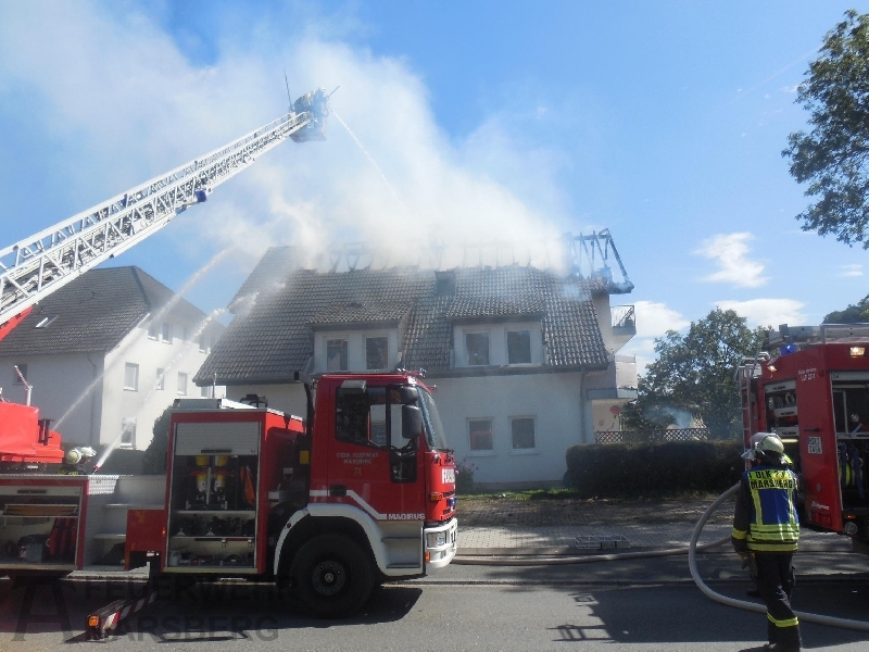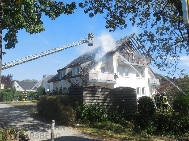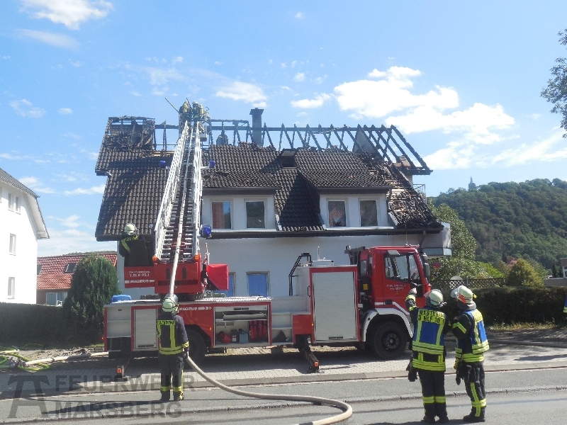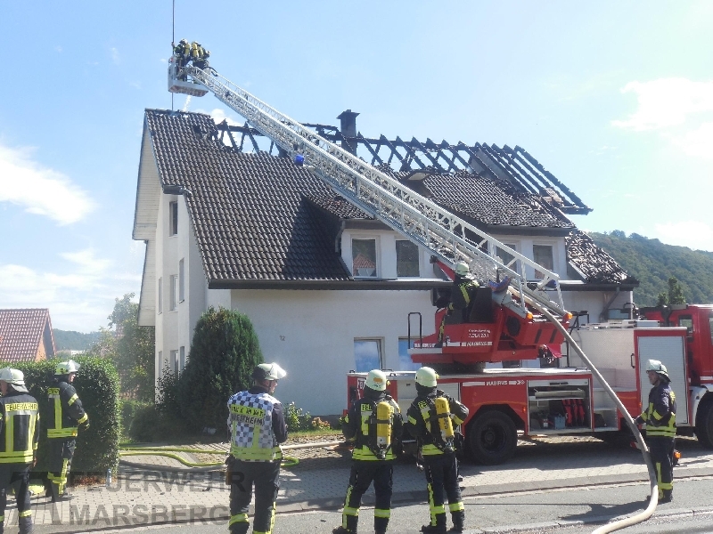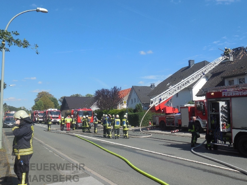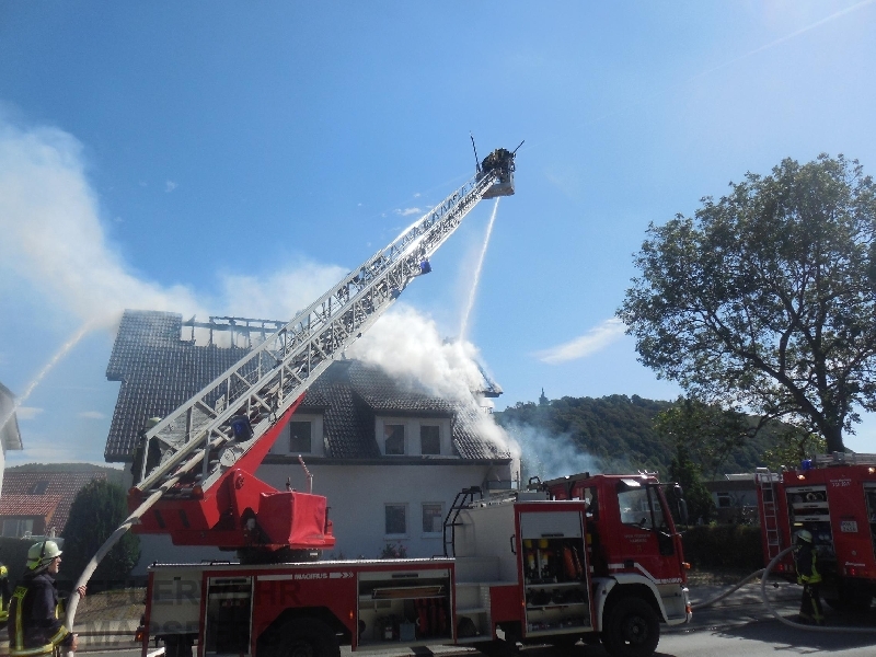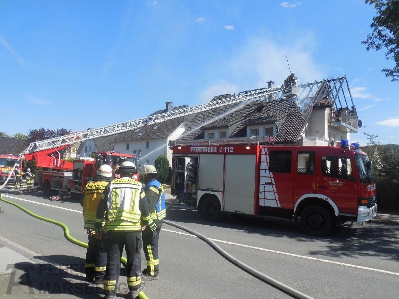 Gegen 13.40 wurde der Brand in dem Haus an der B7 in Marsberg entdeckt – glücklicherweise von zwei Mitarbeitern der Rettungsleitstelle aus Meschede-Enste, die zufällig dienstlich in Marsberg unterwegs waren. Sie konnten rechtzeitig zwei Hausbewohner warnen und unverletzt aus dem Haus bringen, die das Feuer noch nicht bemerkt hatten. Das Feuer war vermutlich auf dem Balkon im Obergeschoss ausgebrochen und hatte sich von dort sehr schnell auf den gesamten Dachstuhl ausgebreitet.