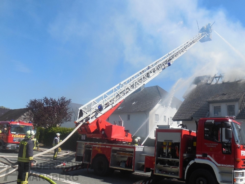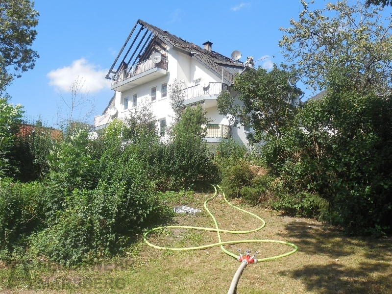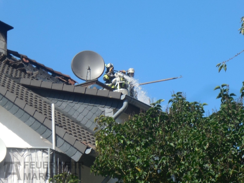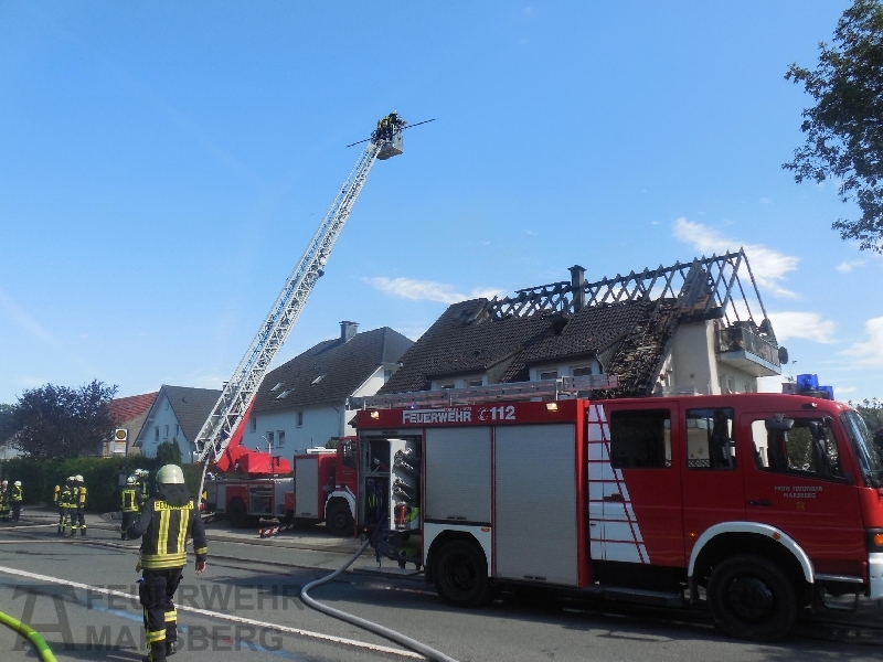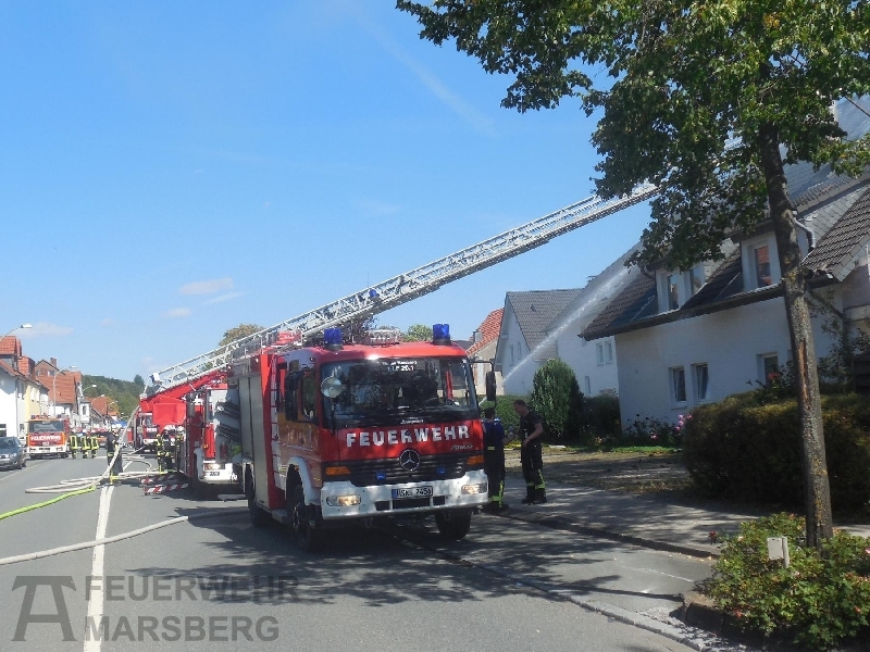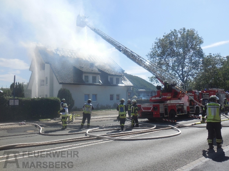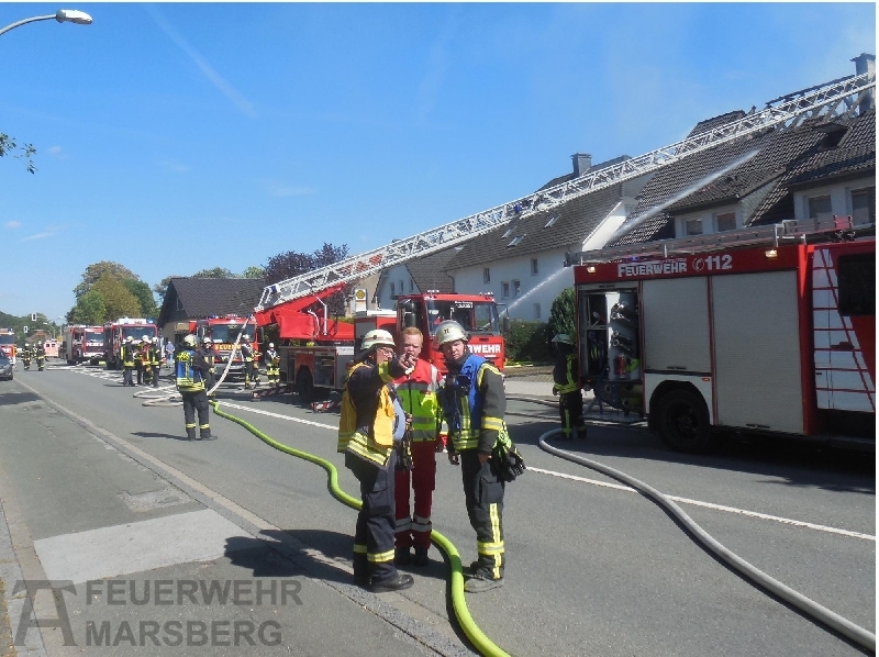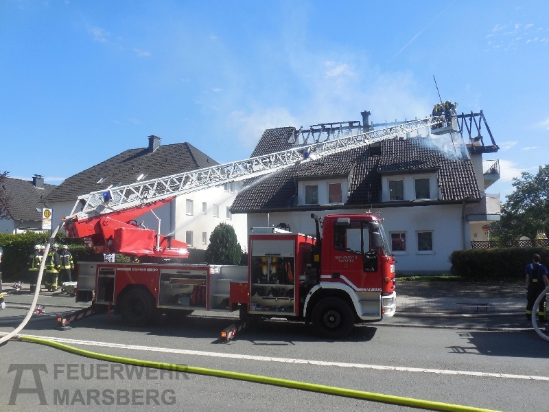 Gegen 13.40 wurde der Brand in dem Haus an der B7 in Marsberg entdeckt – glücklicherweise von zwei Mitarbeitern der Rettungsleitstelle aus Meschede-Enste, die zufällig dienstlich in Marsberg unterwegs waren. Sie konnten rechtzeitig zwei Hausbewohner warnen und unverletzt aus dem Haus bringen, die das Feuer noch nicht bemerkt hatten. Das Feuer war vermutlich auf dem Balkon im Obergeschoss ausgebrochen und hatte sich von dort sehr schnell auf den gesamten Dachstuhl ausgebreitet.