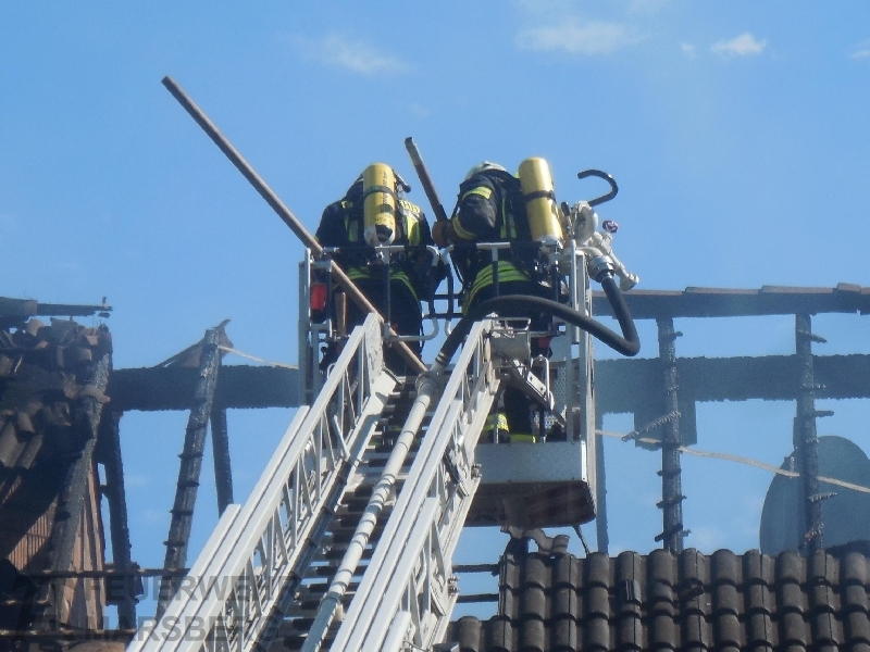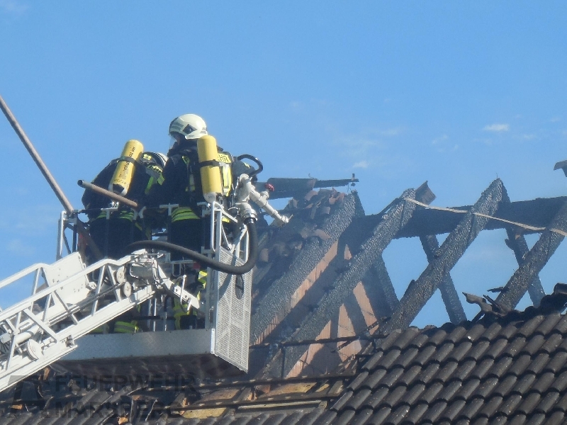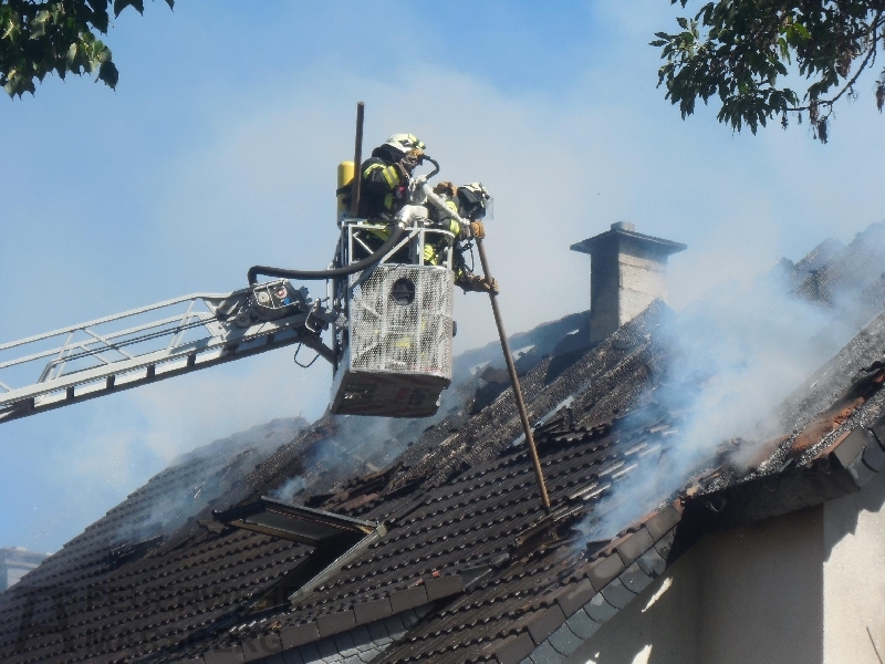 Diese Maßnahmen zeigten schnellen Erfolg: Nach einer knappen halben Stunde war der Brand unter Kontrolle. Einsatzkräfte öffneten anschließend über die Drehleiter die Dachhaut des Hauses, um weitere Glutnester abzulöschen. Nach ca. zwei Stunden war der Brand gelöscht, mehrere Trupps kontrollierten daraufhin im Inneren und über die Drehleiter den Brandraum mit Wärmebildkameras auf eventuelle Glutnester. Im Laufe der Nachlöscharbeiten kam Löschwasser mit Netzmitteln zum Einsatz, um Glutnester in Dachhaut und Zwischendecken effektiver zu bekämpfen.