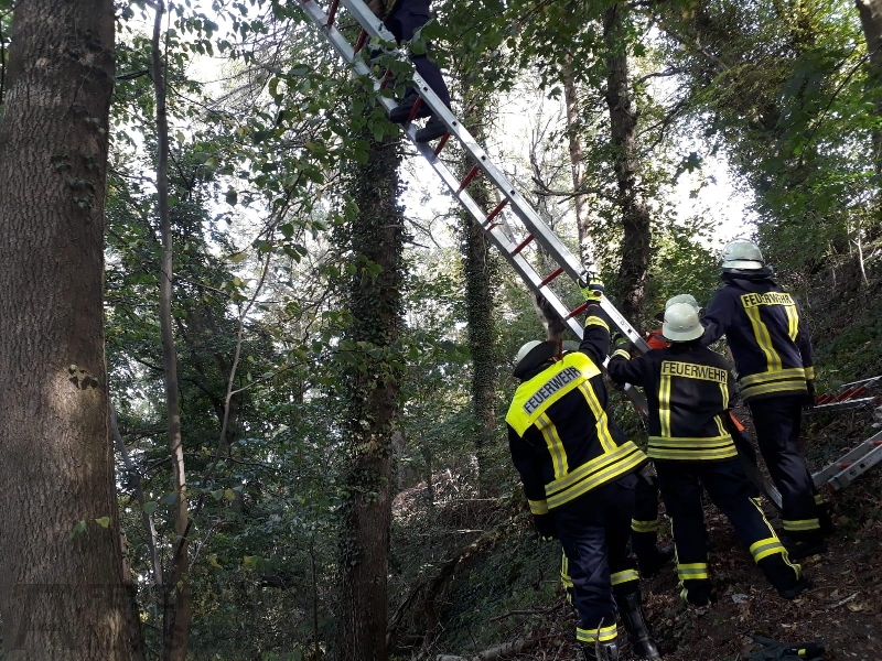Am 24.09.19 wurde Löschgruppe Obermarsberg durch die Leitstelle HSK zu einer Tierrettung im Waldstück "Hagen" "Auf der Mauer" alarmiert. Die Einsatzstelle befand sich direkt hinter dem Feuerwehrhaus, sodass die Einsatzkräfte zu Fuß zur Einsatzstelle gingen. Zu diesem Zeitpunkt war bereits die Besitzerin der Katze vor Ort. Sie berichtet, das "Sudan" seit ein paar Tagen nicht mehr zu Hause gewesen sei. Weitere Spaziergänger berichten, dass die Katze seit mindestens einen im Baum sitze. Sie saß in ca.6m Höhe in einer Astgabel und zeigte sich sichtlich geschwächt. Nachdem der abschüssige Waldboden unter dem Baum begradigt wurde, konnte die vierteilige Steckleiter (drei Teile zeigten sich als ausreichend) sicher aufgestellt werden. Ein Feuerwehrmann stieg bis zur Astgabelung die Leiter hinauf und bekam die Katze zu greifen. Das Tier zeigte sich als sehr zahm und klammerte sich an den Feuerwehrmann. Am Boden angekommen, konnte die Katze ihrer Besitzerin übergeben werden. Der Einsatz zeigte großes Aufsehen bei einigen Bürgern, so dass die eingesetzten Feuerwehrfrauen und Feuerwehrmänner Beifall erhielten. Nachdem sich die Besitzerin bei allen Einsatzkräften bedankte, wurden die Steckleiter zurück gebaut und die Heimreise zu Fuß angetreten.
