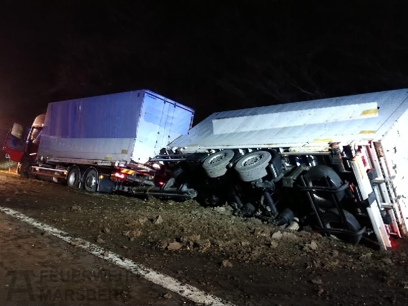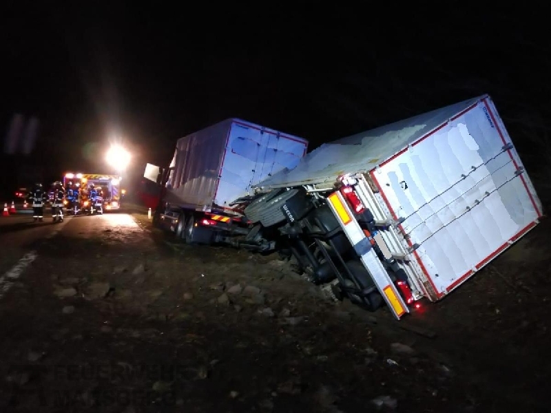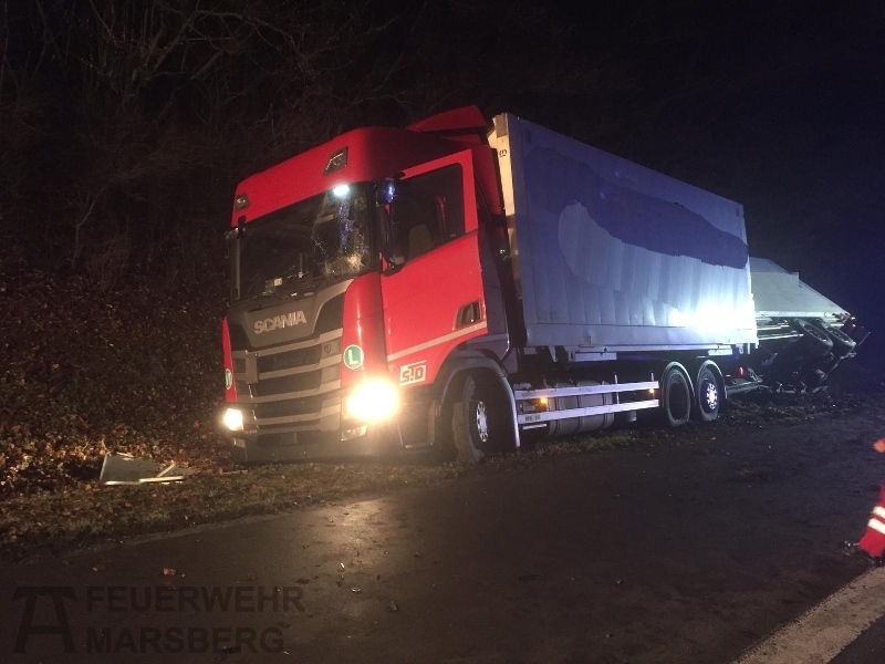 Der Unfall ereignete sich am Montag Abend gegen 20.30 Uhr. Auf der A44 in Richtung Kassel fahrend geriet der LKW samt Anhänger in den Straßengraben, der Anhänger lag schließlich in einer Böschung auf der Seite. Dabei hinterließ er ein langes Trümmerfeld, hauptsächlich aus aufgewühltem Erdreich. Der Fahrer des LKW war zum Glück nicht eingeklemmt, erlitt aber einen Schock.