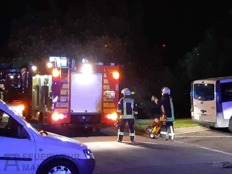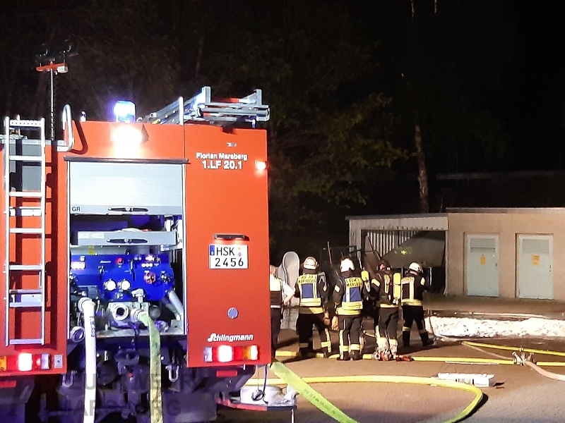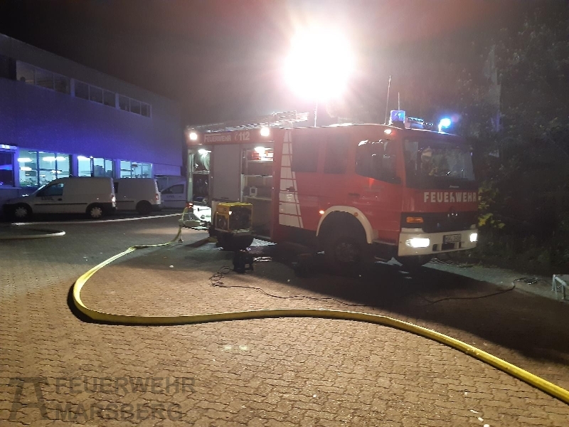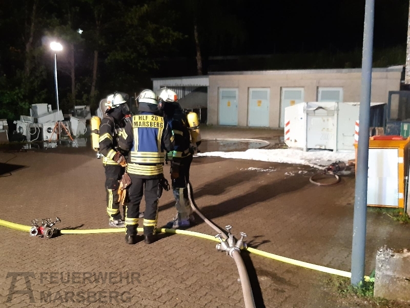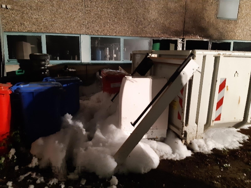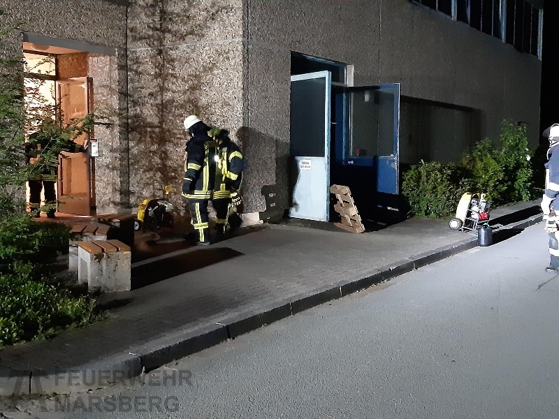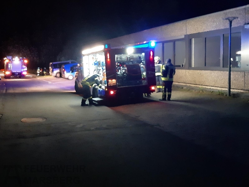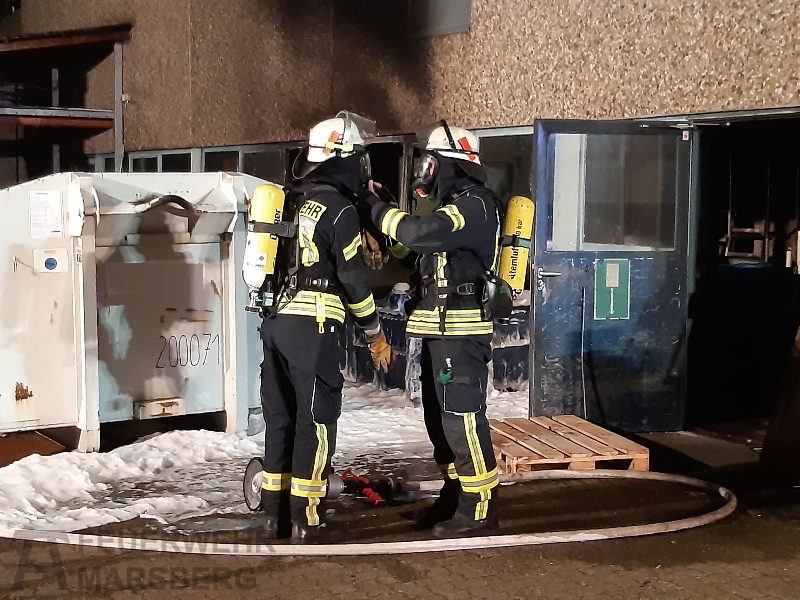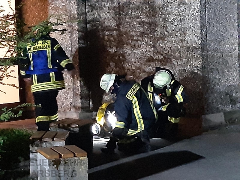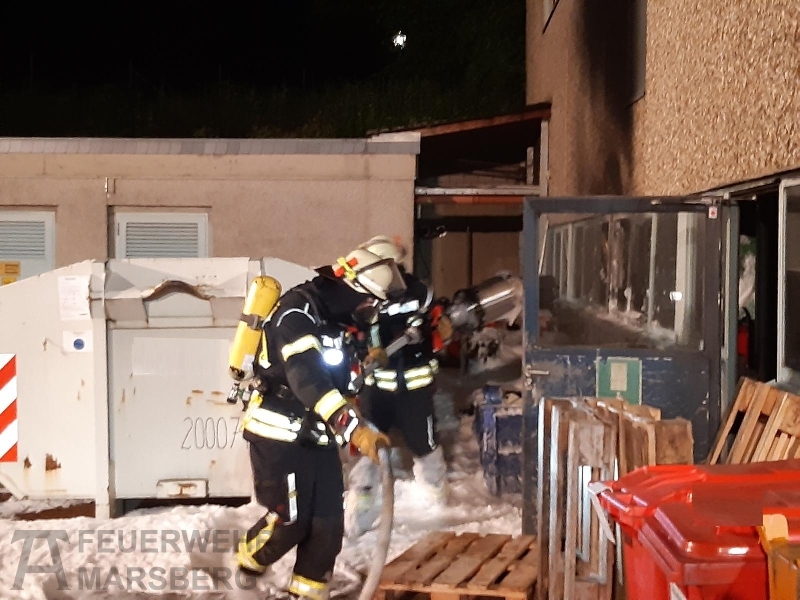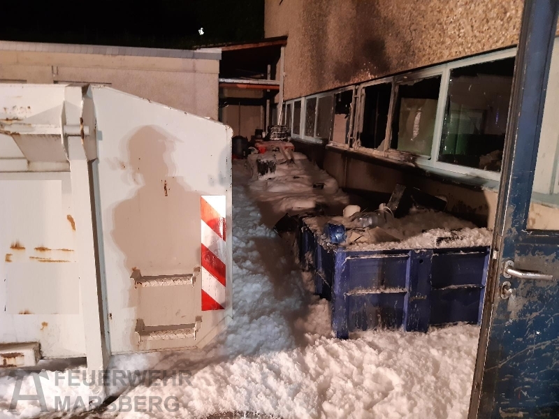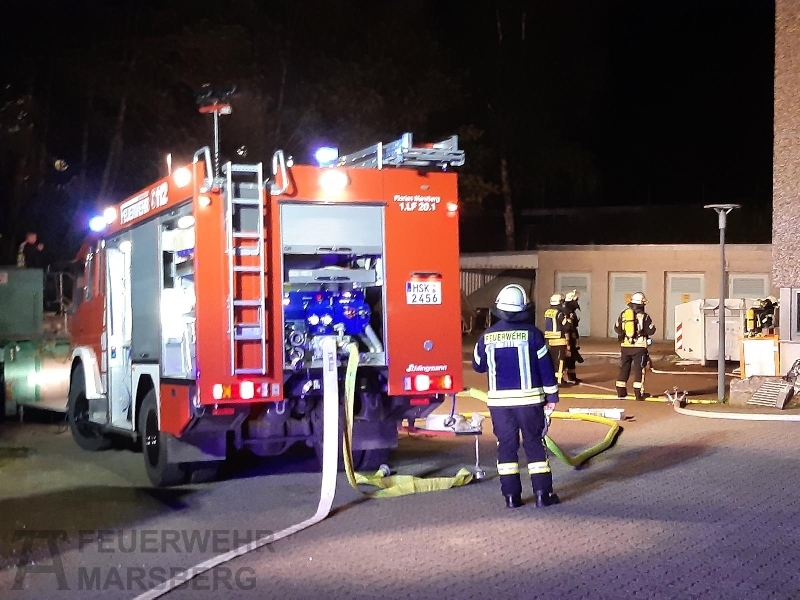 Gegen 0.35 Uhr wurde zuerst der Löschzug Marsberg zu einer aufgelaufenen Brandmeldeanlage alarmiert. Kurz danach erfolgte auch die Alarmierung der Löschgruppen aus Obermarsberg und Erlinghausen: Auf dem Gelände einer Klinik standen Abfallbehälter in Brand, starke Rauchentwicklung war von weitem wahrnehmbar. Vor Ort stellte sich heraus, dass sich die Abfallbehälter direkt an einer Gebäudewand befand. In einigen dieser Behälter waren unter anderem Batterien zur Entsorgung gelagert. Durch das Feuer waren bereits Fensterscheiben gebortsten, wodurch Rauch und Hitze in das Gebäude eindrangen und dort Schäden anrichteten. In dem Gebäude ist unter anderem die Haustechnik und mehrere Werkstätten untergebracht.