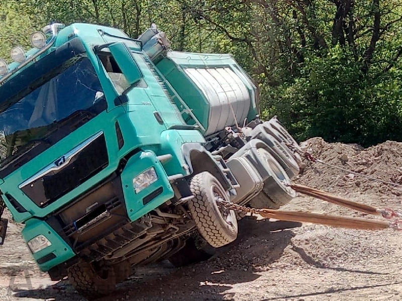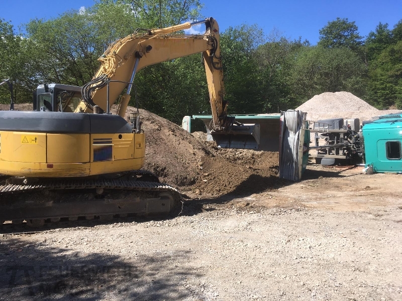 Für die anschließende Bergung des LKW wurde eine Spezialfirma angefordert. Damit diese den LKW aufrichten konnte, wurde mit einem Bagger vorher die Ladefläche des LKW geleert.