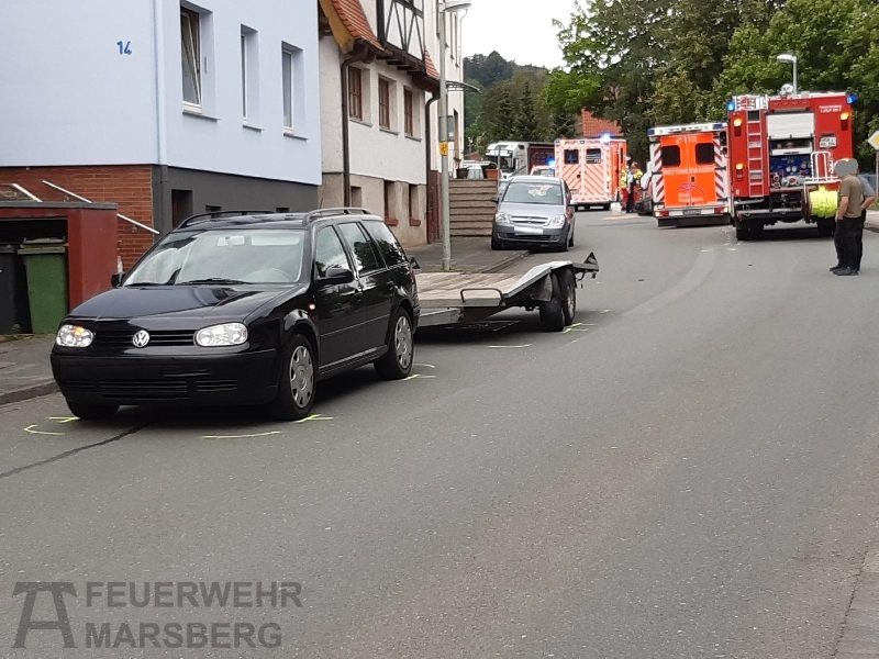 Marsberg: Zu einem Verkehrsunfall wurde am Nachmittag des 9.7.2020 der Löschzug Marsberg sowie Rettungsdienst und Polizei alarmiert. Im Gegenverkehr kollidierte ein PKW seitlich mit dem Anhänger eines in Gegenrichtung fahrenden Autos. Dabei wurden zwei Personen verletzt.