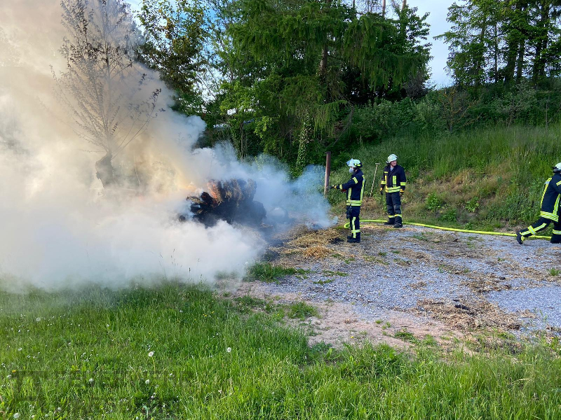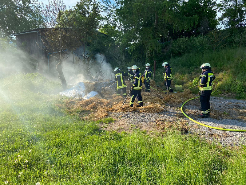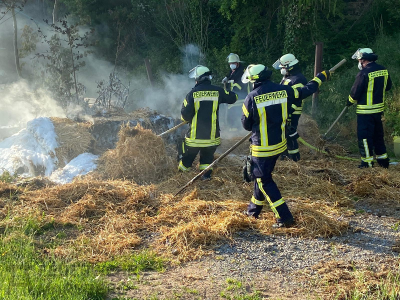 Diese hatten den Brand schnell unter Kontrolle: 15 Strohballen vor einer Scheune brannten. Unter Vornahme von Wasser und Schaum wurden die Ballen abgelöscht, das Stroh auseinandergezogen und weiterhin abgelöscht. Nach anderthalb Stunden war der Einsatz für die Feuerwehr beendet, ca. 40 Einsatzkräfte waren unter der Leitung von Jörn Garbes aus Westheim im Einsatz.