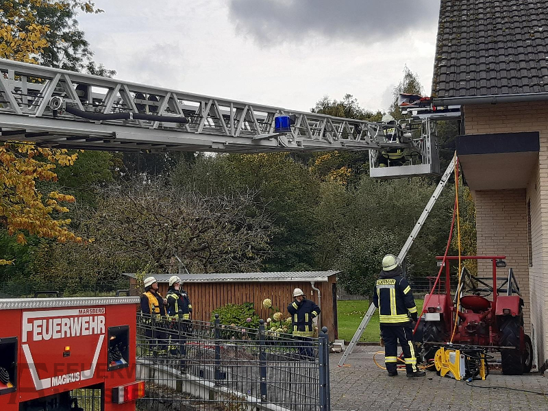 Die Feuerwehr stellte zusammen mit den First Respondern die Erstversorgung sicher bis zum Eintreffen des Rettungsdienstes. Parallel wurde die Rettung vorbereitet: Der Sturz wurde mit Rüsthölzern unterbaut, hydraulische Spreizer wurden in Stellung gebracht, um den Sturz sicher anheben zu können. Von außen ging die Drehleiter des Löschzugs Marsberg in Bereitschaft, um den Verletzten sicher aus dem Obergeschoss ins Freie zu retten.