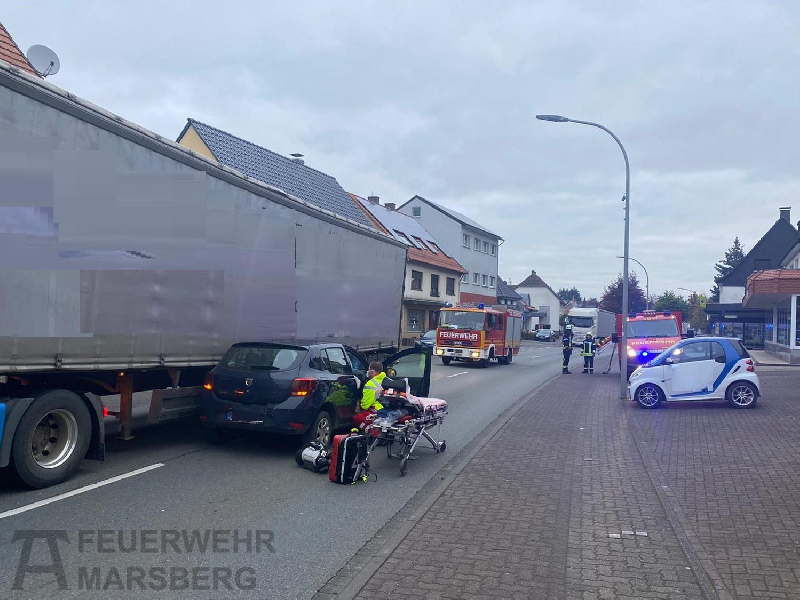Westheim: Zu einem Verkehrsunfall wurden am Vormittag des 27.10.2021 mehrere Einheiten der Feuerwehr Marsberg alarmiert: In der Ortsdurchfahrt in Westheim stießen ein PKW und ein LKW miteinander zusammen. Dabei sah es zunächst so aus, dass die Fahrerin des PKW in ihrem Auto eingeschlossen war und sich nicht mehr selbst befreien konnte: Der PKW war mit der Fahrerseite mit dem Auflieger des LKW geraten. Daher wurden neben dem Rettungsdienst auch Einheiten der Feuerwehr alarmiert.