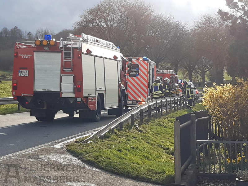 Bredelar: Ein Verkehrsunfall mit einer verletzten Person hat am späten Nachmittag des 9.4.2022 Feuerwehr, Rettungsdienst und Polizei auf den Plan gerufen. Auf der B7 kam ein PKW von der Straße ab. Die Fahrerin wurde dabei verletzt. Feuerwehr und Rettungsdienst konnten die Frau schnell retten.