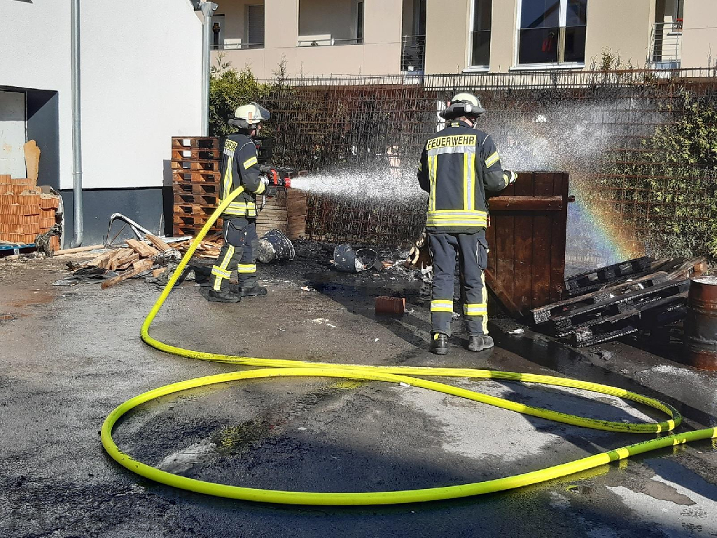 Mit insgesamt 2 C-Rohren konnte der Brand schnell gelöscht werden, der letztlich nur auf den Rollstuhl, die Hecke und die Holzpaletten beschränkt blieb. Lediglich ein Teil einer Türverkleidung wurde bei dem Einsatz beschädigt.