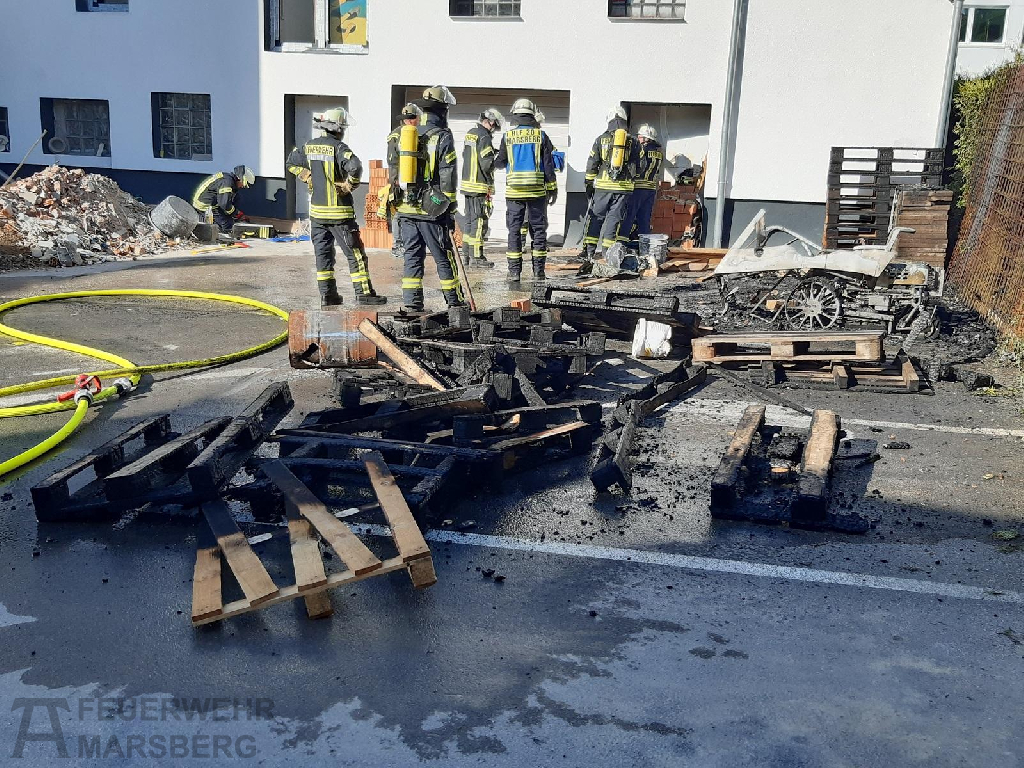 Unverzüglich wurde ein Löschangriff unter Atemschutz eingeleitet und die betroffenen Paletten von der Hauswand entfernt. Ebenso wurden weitere Kräfte des Löschzugs Marsbergs nachalarmiert.