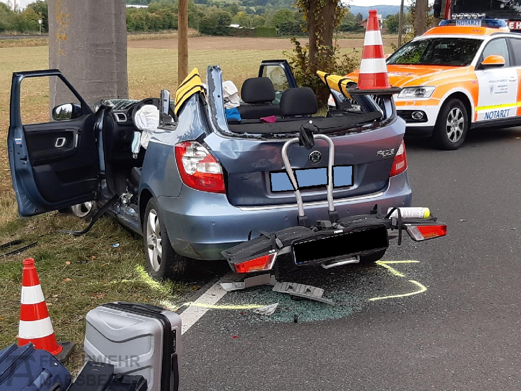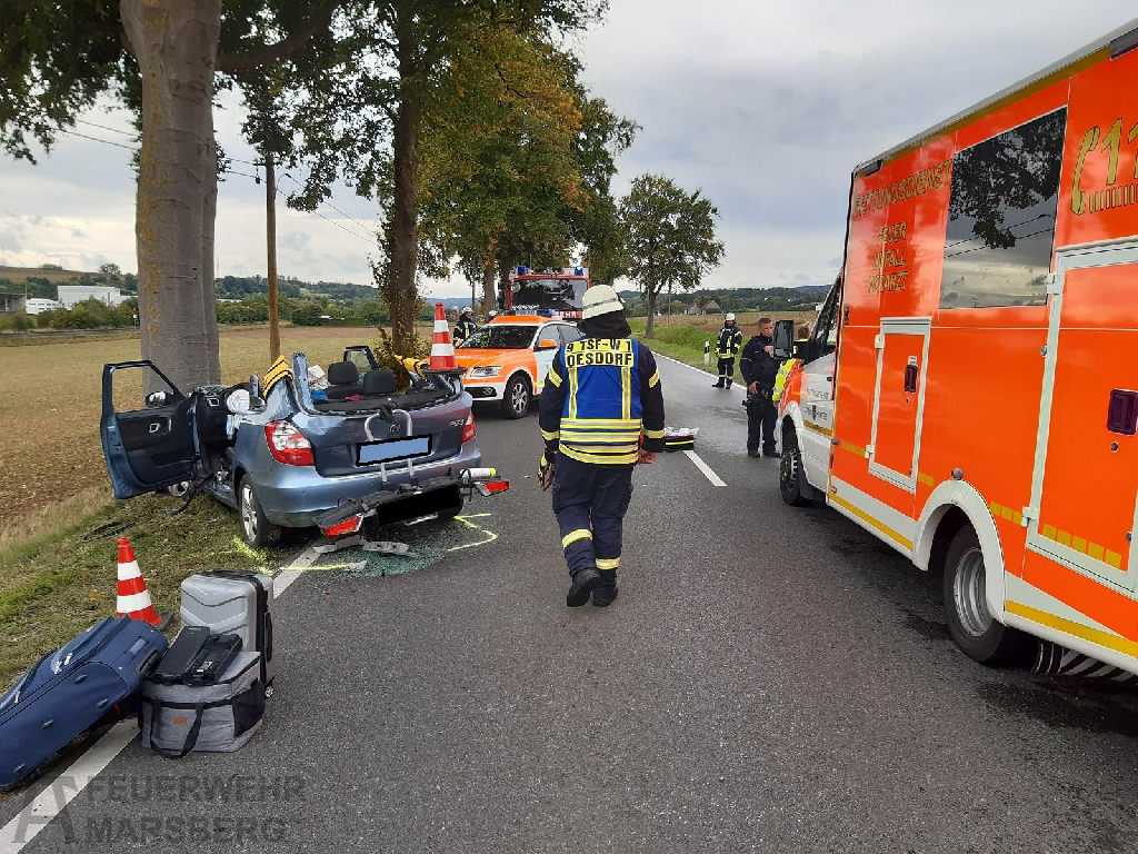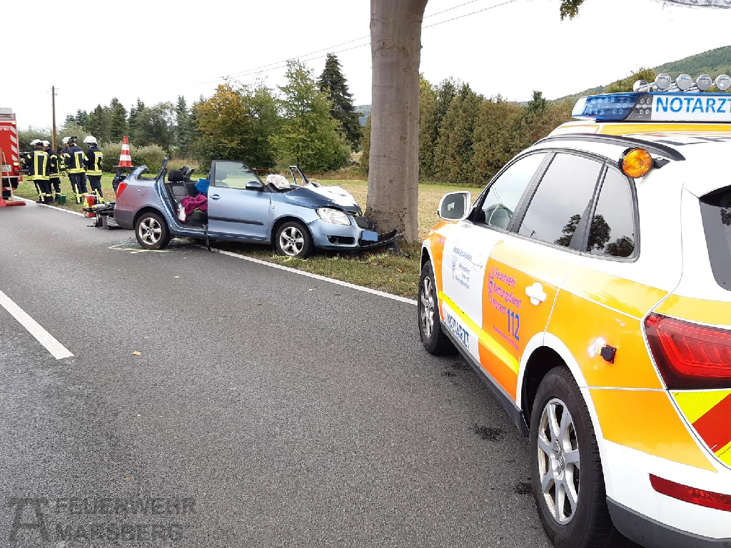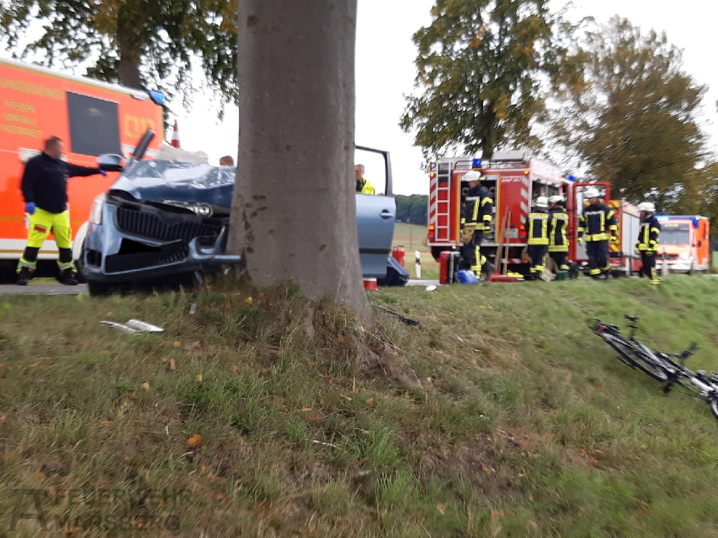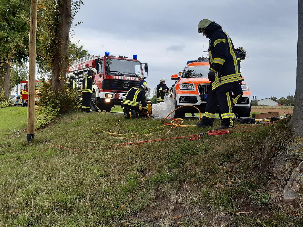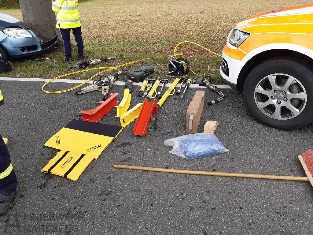 Die ersten Einsatzkräfte vor Ort konnten schnell feststellen, dass zwei Personen in ihrem PKW eingeklemmt waren, der vor einen Baum geraten war. Beide waren ansprechbar und stabil. Weitere Verletzte gab es nicht.