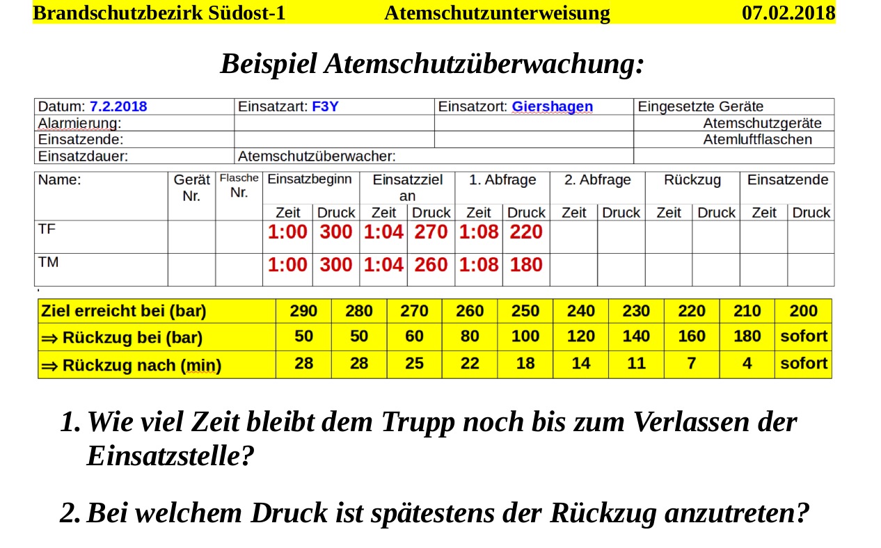 In Kleingruppen mussten die beiden Fragestellungen bearbeitet werden, anschließend wurden die vorgelegten Antworten mit einer vorbereiteten Musterlösung verglichen und fachliche Fragestellungen geklärt. Zum Abschluss wurden anhand eines weiteren Fallbeispiels die Grundsätze der Atemschutzüberwachung besprochen.