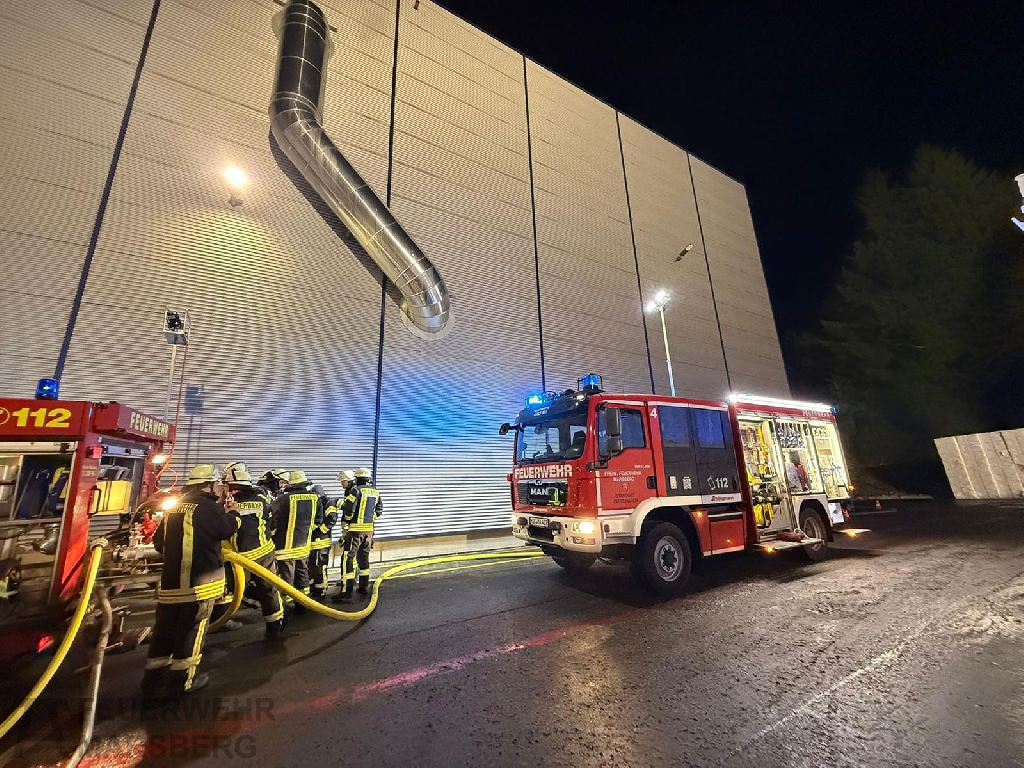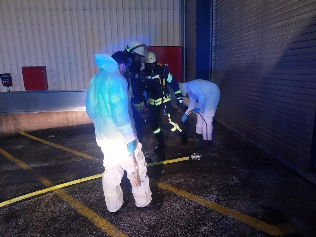 Eine Sprinkleranlage löste aus, Werkspersonal begann bereits mit eigenen Löscharbeiten. Die Feuerwehr nahm sodann einen Löschangriff unter Atemschutz vor und kontrollierte die betroffene Rohrleitung mit einer Wärmebildkamera. In einem Teil der Leitung musste unter Atemschutz eine Öffnung geschnitten werden, um das darin enthaltene Brandgut abzulöschen; die Leitung befand sich in mehreren Metern Höhe. Ferner wurde die gesamte Rohrleitung kontrolliert, um eine Brandausbreitung auszuschließen.