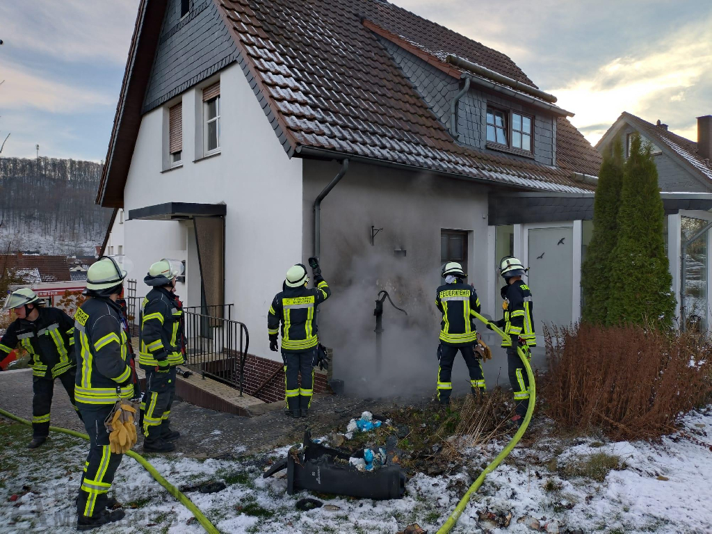 Marsberg: Die Löschgruppen Beringhausen und Bredelar wurden heute Nachmittag zu einer brennenden Mülltonne im Freien nach Beringhausen alarmiert. Insgesamt vier Mülltonnen hatten an einer Hausfassade Feuer gefangen.