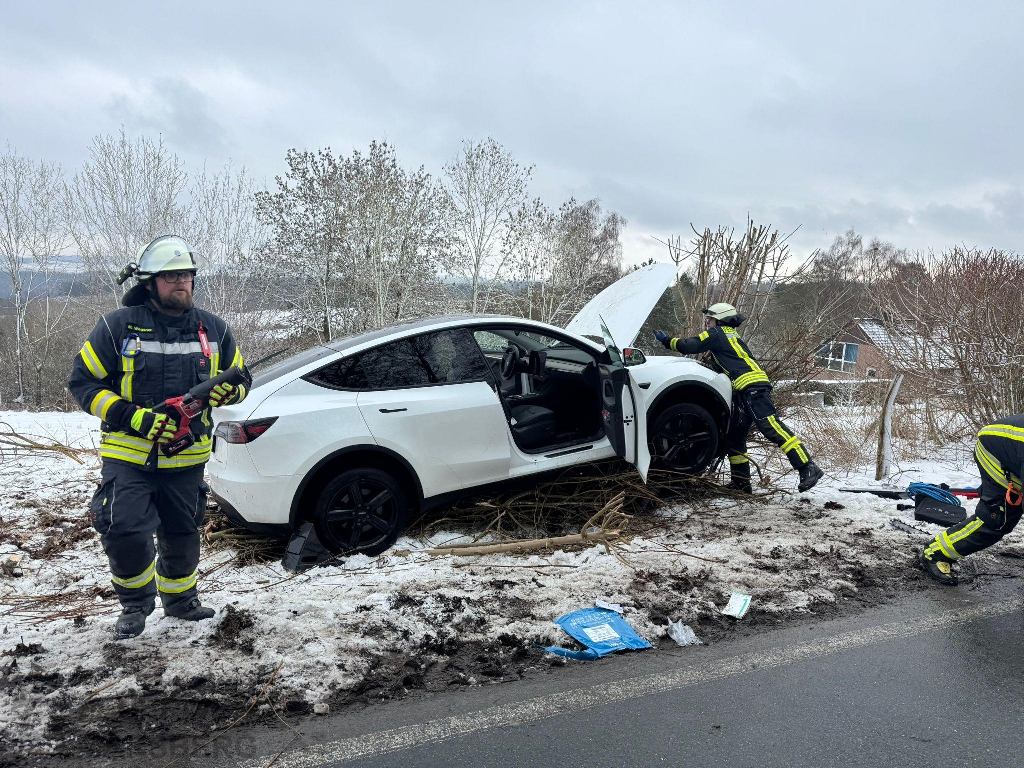 Gegen 12.00 wurden die Löschgruppen Essentho, Meerhof, Oesdorf und Westheim sowie der Löschzug Marsberg, die Rathauswache und der Rettungsdienst alarmiert: Kurz vor dem Ortseingang Essentho aus Richtung Meerhof kam es zu einem Verkehrsunfall: Eine Frau kam mit ihrem Fahrzeug aus noch ungeklärter Ursache von der Straße ab und kollidierte mit Gebüsch am Straßenrand und konnte sich nicht selbst aus dem Fahrzeug befreien. Durch den Rettungsdienst wurde die Person versorgt, die Feuerwehr stabilisierte das Fahrzeug mit zwei Paratech-Stützen und schaltete das E-Auto stromlos. Hierbei leistete eine Rettungskarte, die über die Leitstelle digital bereitgestellt werden konnte, gute Hilfe.