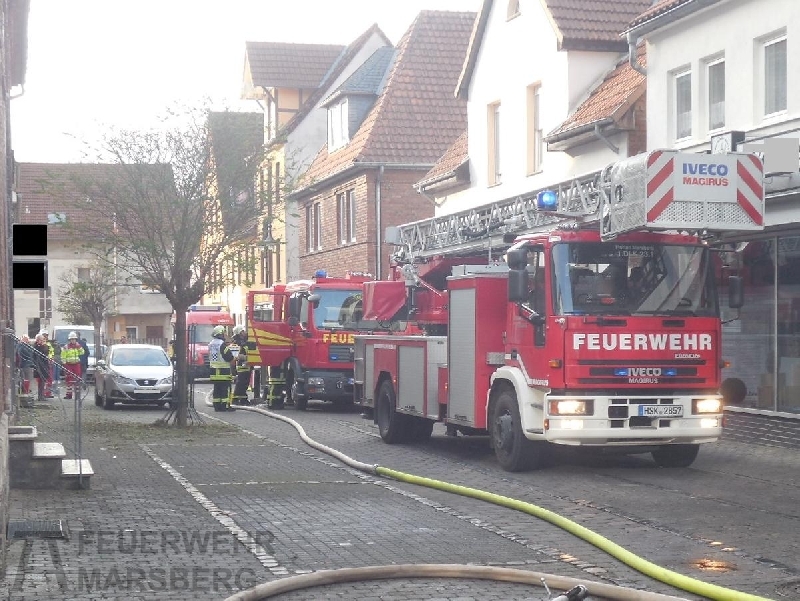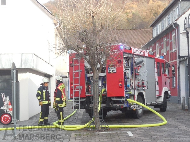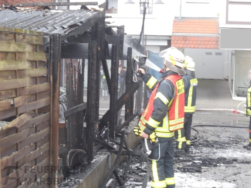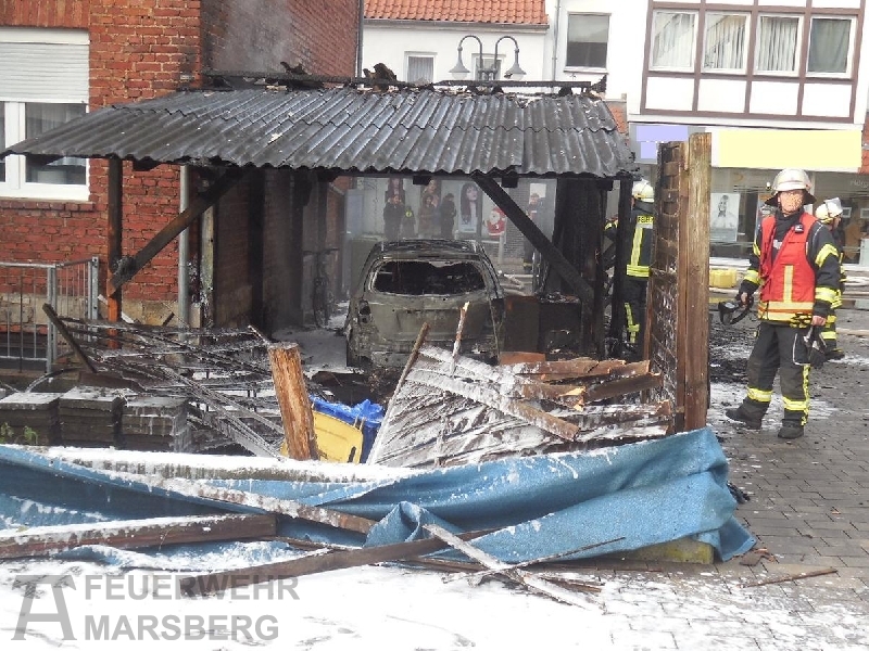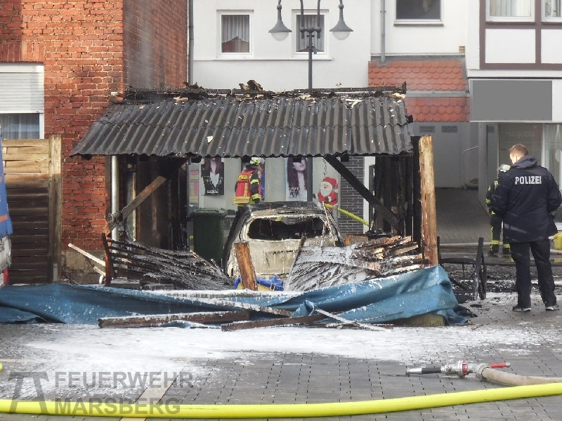 Marsberg: Glimpflich abgelaufen ist ein Brand an einem Wohnhaus am Dienstag Mittag in der Marsberger Innenstadt. Während das angebaute Carport und ein darin geparkter PKW komplett ausbrannten, konnte ein Übergreifen des Feuers auf das Gebäude selbst durch die Feuerwehr verhindert werden. Ein benachbartes Bankgebäude wurde sicherheitshalber evakutiert. Etwa 30 Einsatzkräfte aus Marsberg und Obermarsberg waren im Einsatz, Personen kamen bei dem Brand nicht zu schaden. Augenzeugen zufolge waren kurz nach Ausbruch des Brandes explosionsartige Geräusche zu vernehmen, geborstene Eternitplatten lagen in der näheren Umgebung des Brandherds.