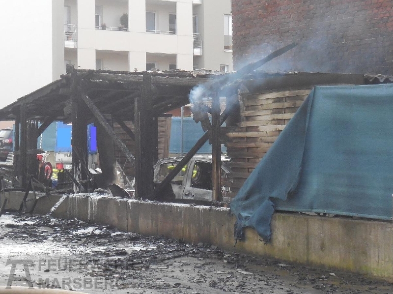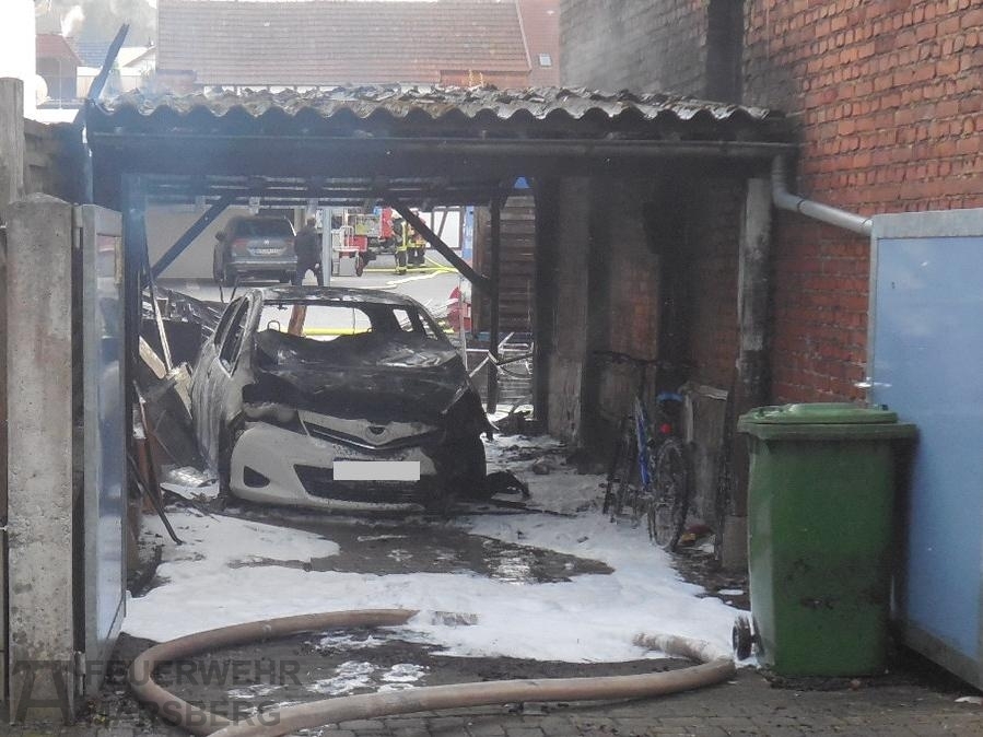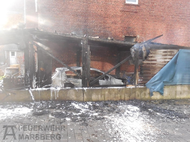 Gegen 12.50 wurde der Löschzug Marsberg zu einem Brand in einem PKW-Unterstand in die Magnusstraße alarmiert. Bei Eintreffen des ersten Fahrzeugs standen bereits das komplette Carport samt abgestelltem PKW in Vollbrand, das Feuer drohte auf das unmittelbar angrenzende Wohnhaus überzugreifen.