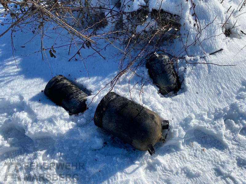 Während der Brandbekämpfung stellte sich heraus, dass sich eine Gasflasche in der Hütte befand. Daraufhin zogen sich alle Einsatzkräfte in sichere Entfernung zurück. Glücklicherweise explodierte die Gasflasche nicht, sondern blies über ein Sicherheitsventil deutlich hörbar ab. Nachdem die Gasflasche abgeblasen war, konnte der Löschangriff fortgesetzt werden. Hier kam dann zusätzlich noch ein B-Rohr zum Einsatz, etwas später wurde auch das tragbare Schaumlöschgerät der LG Oesdorf eingesetzt.