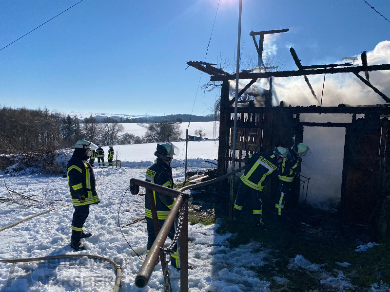 Oesdorf: Ein Brandeinsatz in Oesdorf hat in den Mittagsstunden des 13.2.2021 die Feuerwehren aus Oesdorf, Westheim, Meerhof und Marsberg gefordert: Eine kleine Jagdhütte stand aus ungeklärter Ursache in Vollbrand. Bei eisigen Temperaturen gelang es den Einsatzkräften schnell, das Feuer zu löschen. In der Hütte gelagerte Gasflaschen stellten dabei eine besondere Herausforderung für die Einsatzkräfte dar.