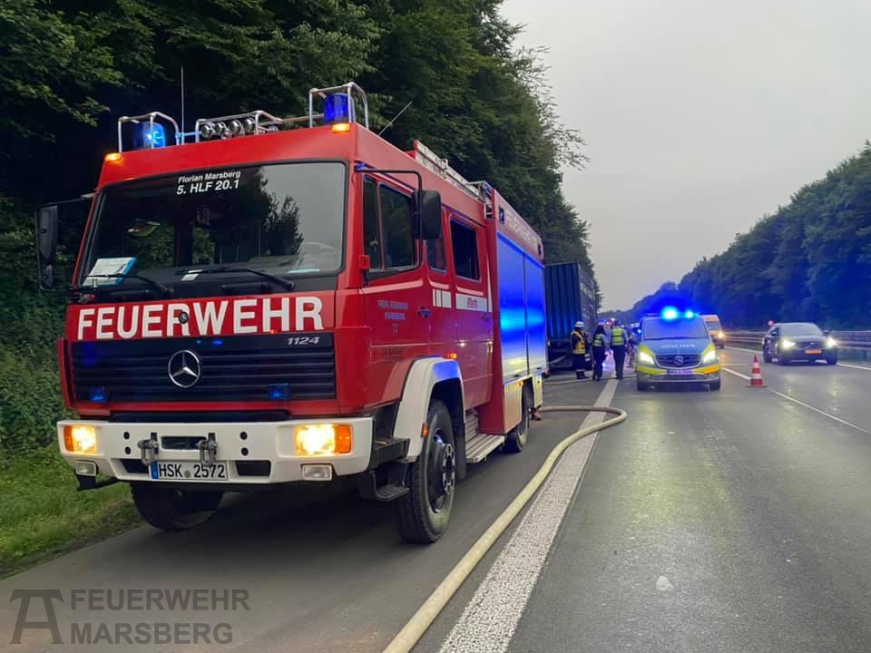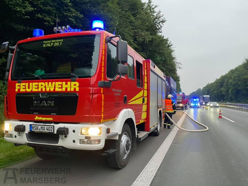 Die Feuerwehren aus Meerhof, Oesdorf, Essentho sowie der ELW aus Marsberg wurden am Abend des 16.7.2021 zu einem LKW-Brand auf die A44 alarmiert.