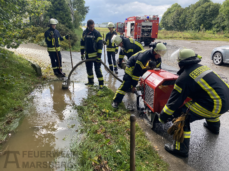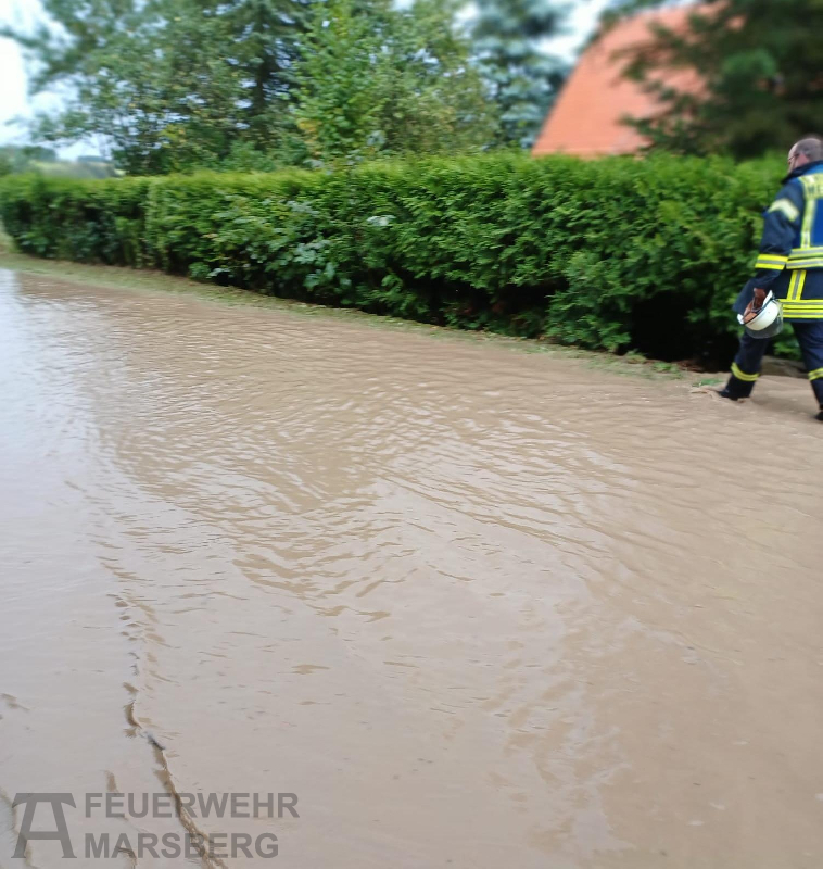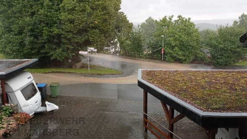 Gegen 15.00 gingen mehrere Notrufe bei der Leitstelle ein; aus Obermarsberg, Essentho und Marsberg. Überall wurden volllaufende Keller und überflutete Straßen gemeldet.