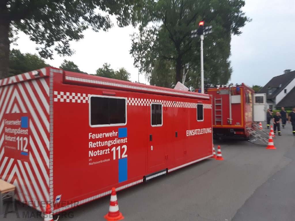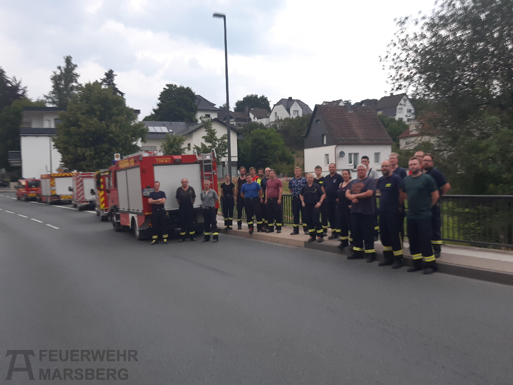 Auch die Feuerwehr der Stadt Marsberg stellte einen überörtlichen Löschzug: 32 Feuerwehrfrauen und -männer aus Marsberg, Westheim, Essentho, Giershagen, Beringhausen und Oesdorf waren vom 20. auf den 21.7.2022 unter der Führung von Ralph Pohle knapp fünf Stunden in Stemel im Einsatz.