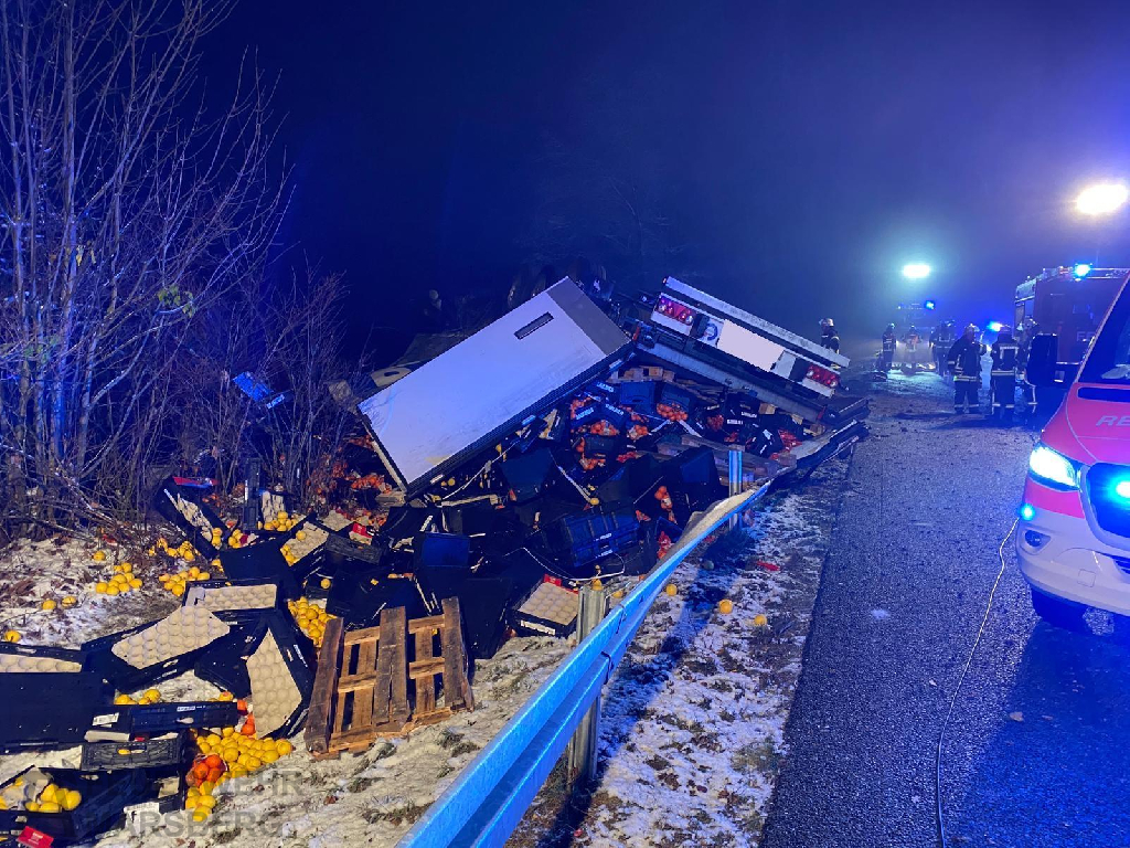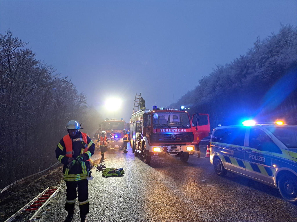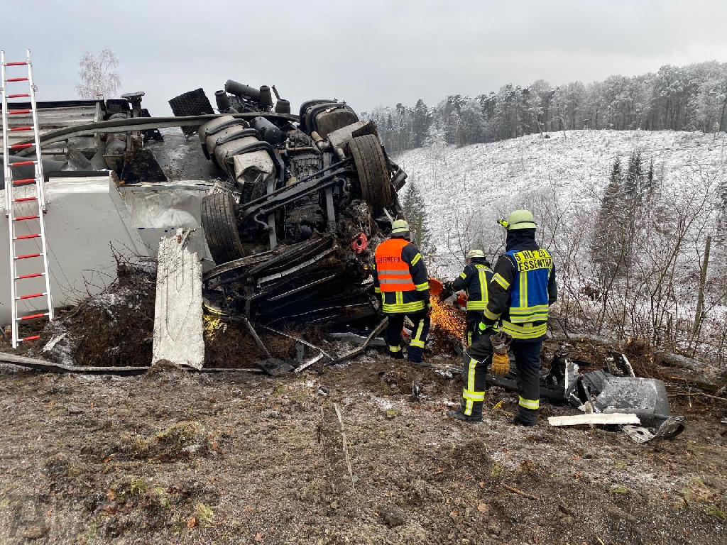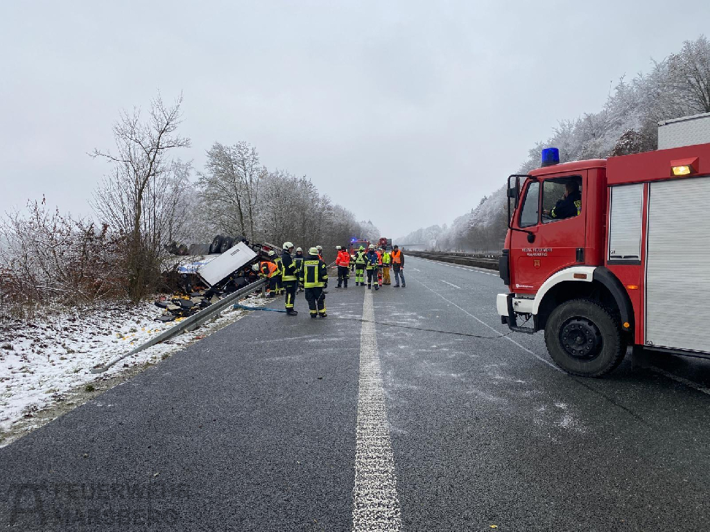 Gegen 7.00 morgens wurden die Feuerwehren aus Essentho, Meerhof und Oesdorf auf die A44 alarmiert. Ein LKW war auf spiegelglatter Fahrbahn von der Straße abgekommen und lag im Straßengraben. Gemäß Alarmmeldung war der Fahrer nicht eingeklemmt und bereits aus dem Unfallfahrzeug befreit. Trotzdem gestaltete sich der Einsatz sehr aufwändig und langwierig: Aufgrund der Glätte gestaltete sich die Anfahrt der Einsatzkräfte schwierig. Der verunfallte LKW hatte sich zudem komplett überschlagen und hatte bei dem Unfall einen Großteil seiner Ladung, mehrere Paletten Obst, verloren.