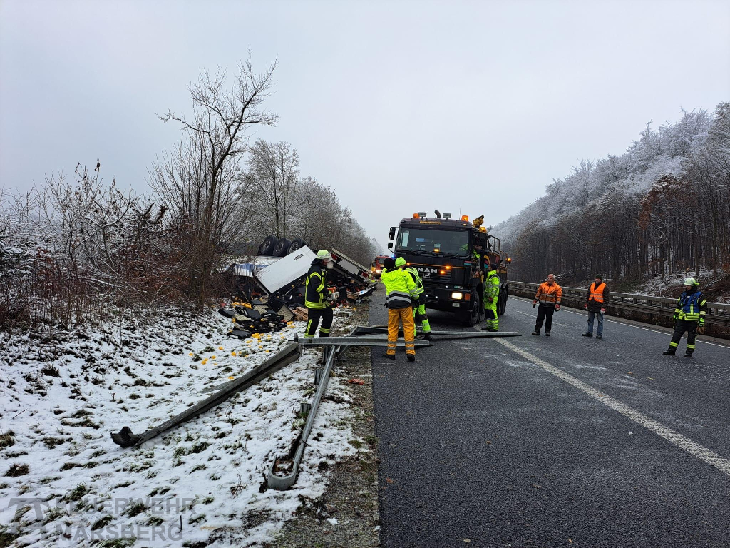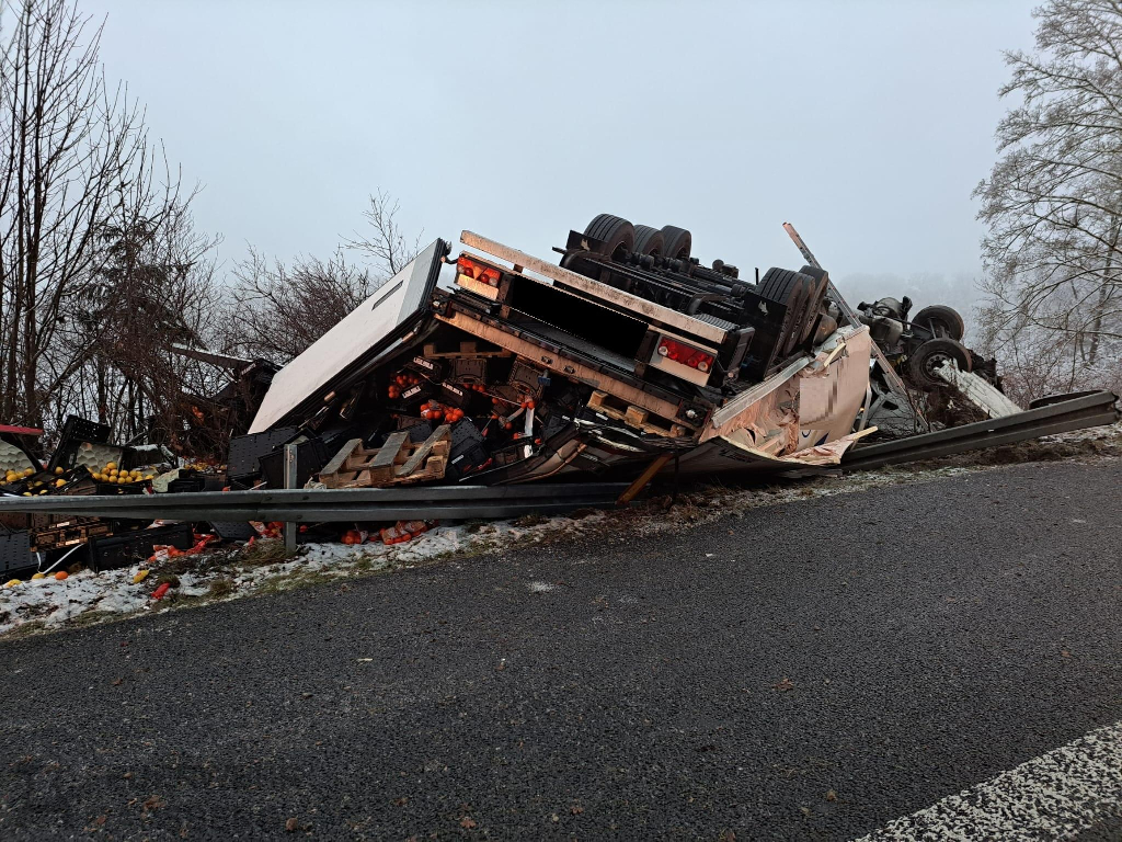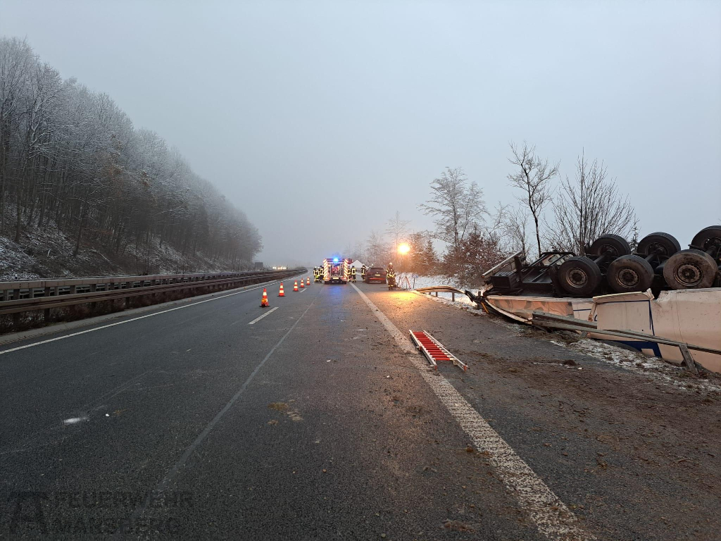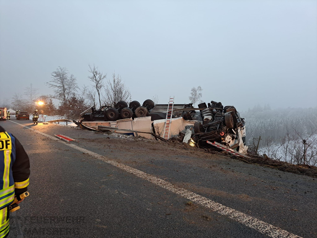 A44: LKW-Unfall auf eisglatter Fahrbahn