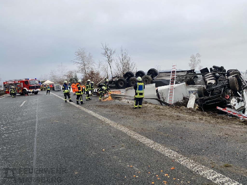 Seitens der Feuerwehr wurde die Unfallstelle und das Unfallfahrzeug abgesichert. Ferner wurden auslaufende Betriebsstoffe aufgenommen und LKW-Diesel aus dem Tank des Fahrzeugs umgepumpt. Für die Bergung des LKW wurde ein Spezialunternehmen angefordert. Durch dieses wurde das LKW-Wrack zunächst wieder auf die Reifen gestellt und anschließend auf einen Tieflader verladen. Die Feuerwehr unterstützte während dessen.