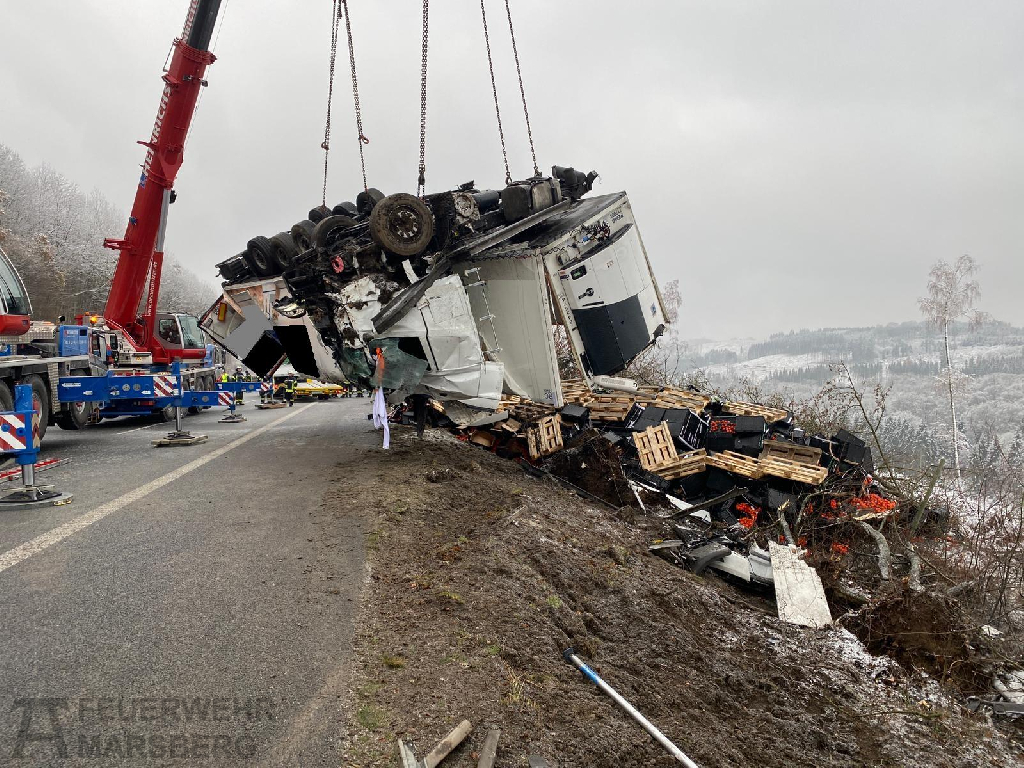Der Fahrer des LKW wurde nach Sichtung durch den Rettungsdienst nur leicht verletzt und kam ins Krankenhaus nach Marsberg.
