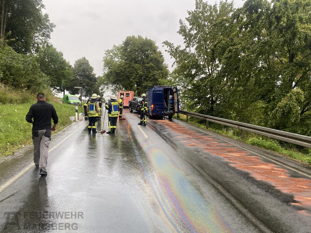 Oesdorf: Ein Verkehrsunfall mit zwei verletzten Personen ereignete sich am Morgen des 27.7.2023 zwischen Oesdorf und Meerhof. Polizei, Rettungsdienst und Feuerwehr waren vor Ort. Für die Feuerwehr bestand die Hauptaufgabe darin, auslaufende Betriebsstoffe aufzufangen – was sich wegen des Regens sehr aufwändig gestaltete.