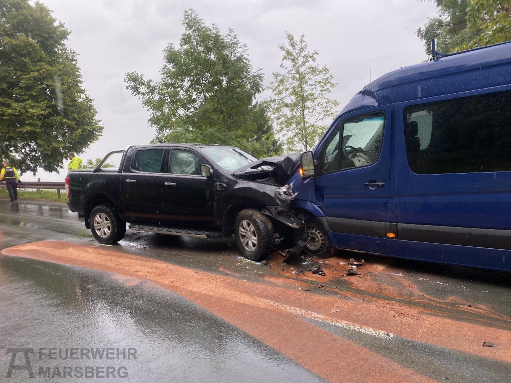 Gegen 7.45 wurden zunächst Rettungsdienst und Polizei zu dem Verkehrsunfall alarmiert. Vermutlich geriet ein PKW in einer Kurve in den Gegenverkehr und stieß frontal mit einem Sprinter zusammen.