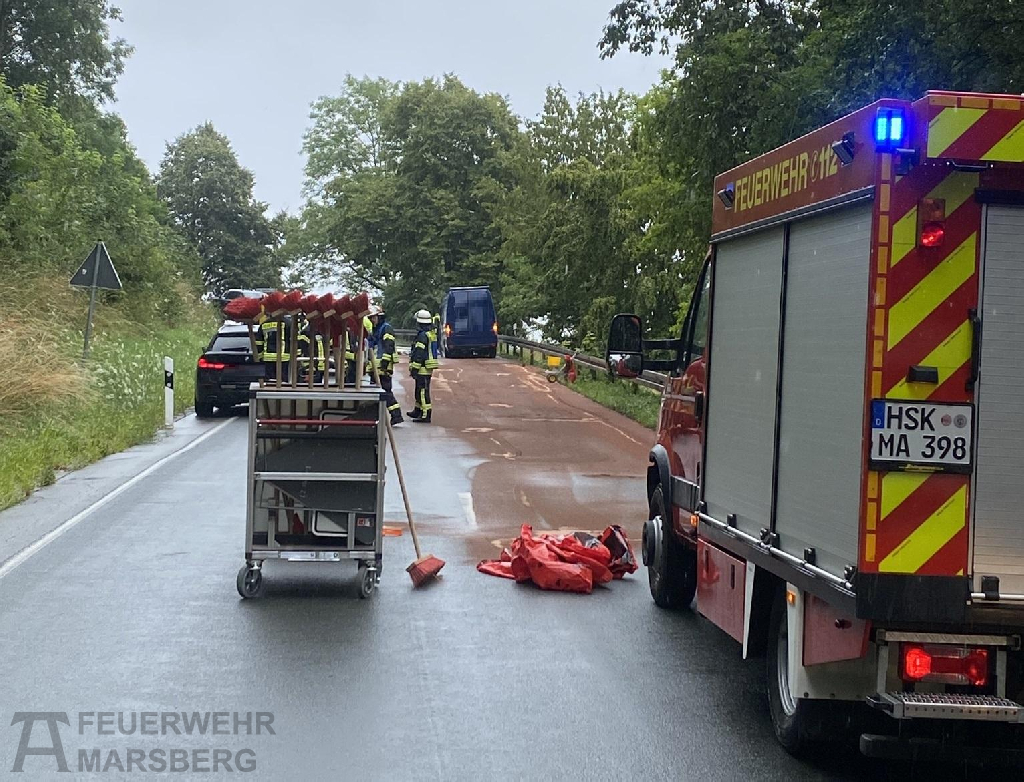 Insgesamt waren ca. 20 Einsatzkräfte der Feuerwehr aus Marsberg, Meerhof und Oesdorf im Einsatz, dazu die Polizei, zwei Rettungswagen, die Untere Wasserbehörde, der Bauhof der Stadt Marsberg sowie zwei Abschleppfahrzeuge und eine Kehrmaschine für die Aufnahme des Bindemittels.