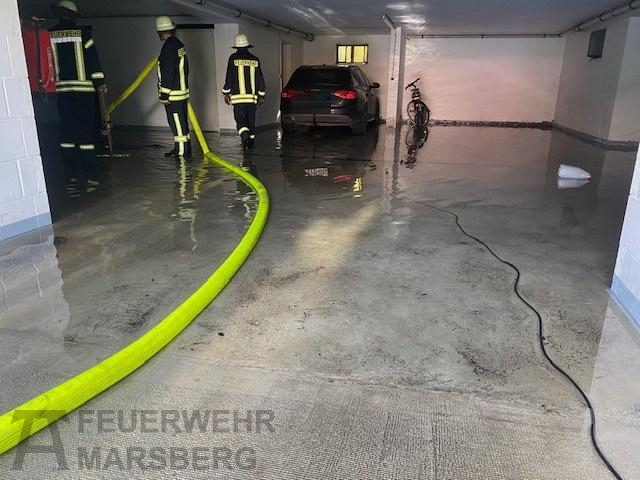 Es galt mehrere Keller und Straßen vom Wasser zu befreien, ebenso eine Tiefgarage. Insgesamt war die Feuerwehr an 15 Einsatzstellen. Allein aus der Tiefgarage mussten etwa 20m² Wasser abgepumpt werden. Hier drohten elektrische Anlagen mit Wasser voll zu laufen.