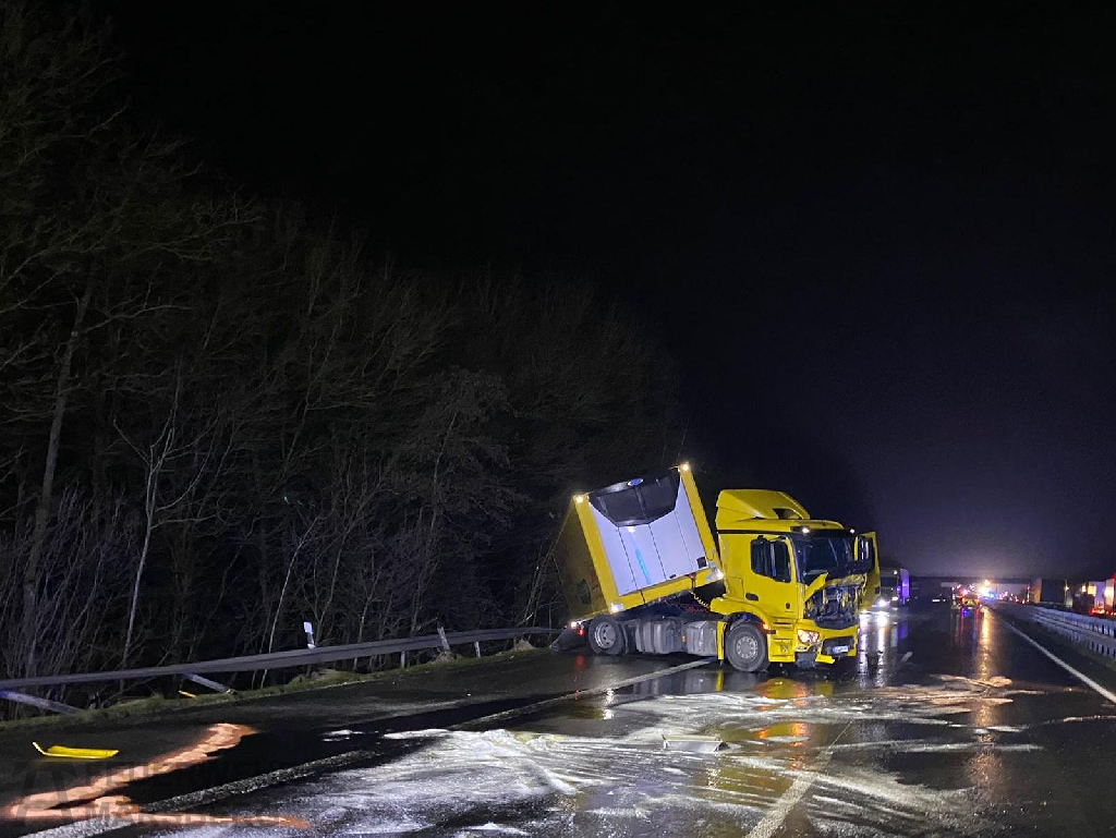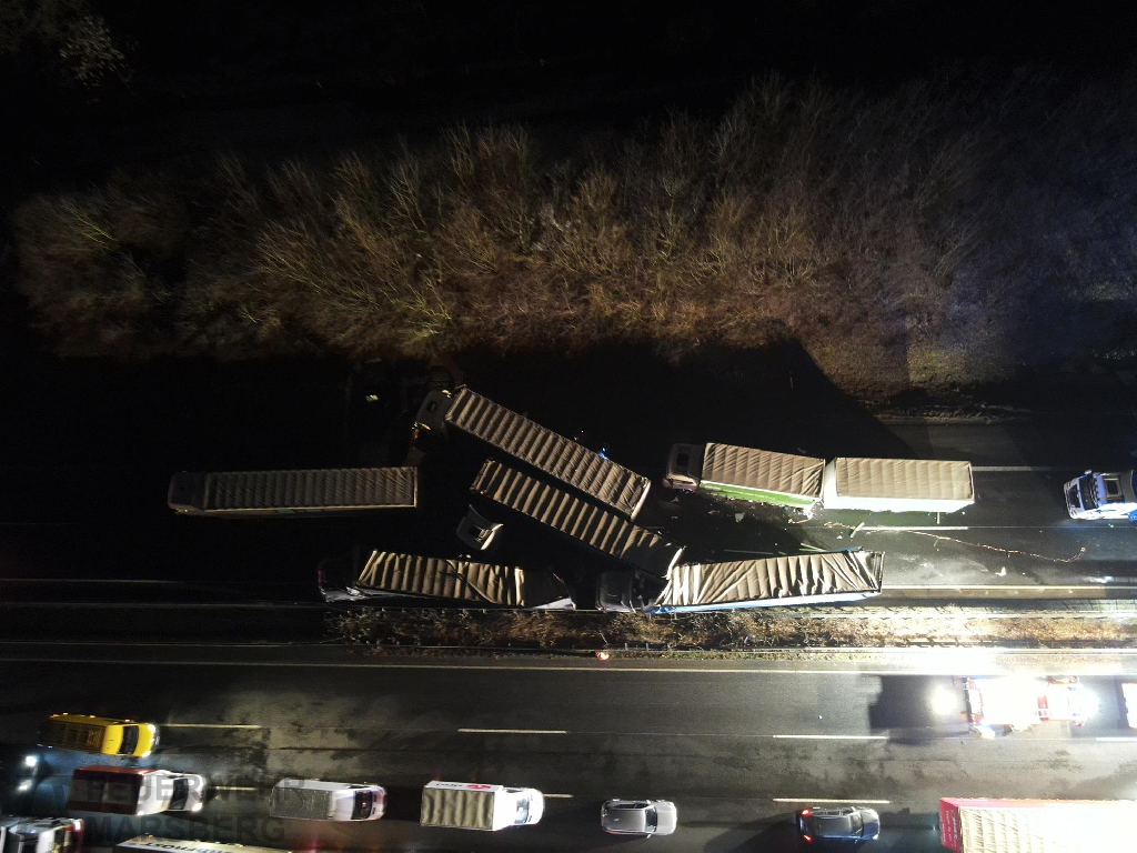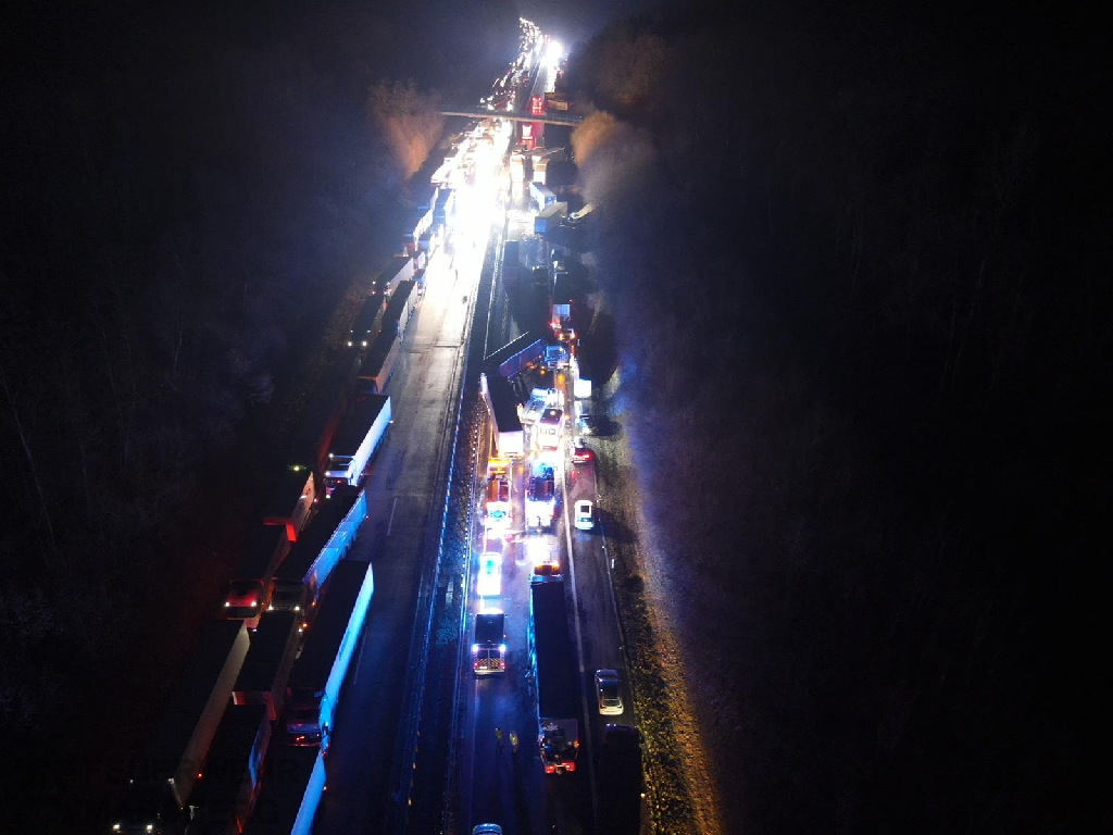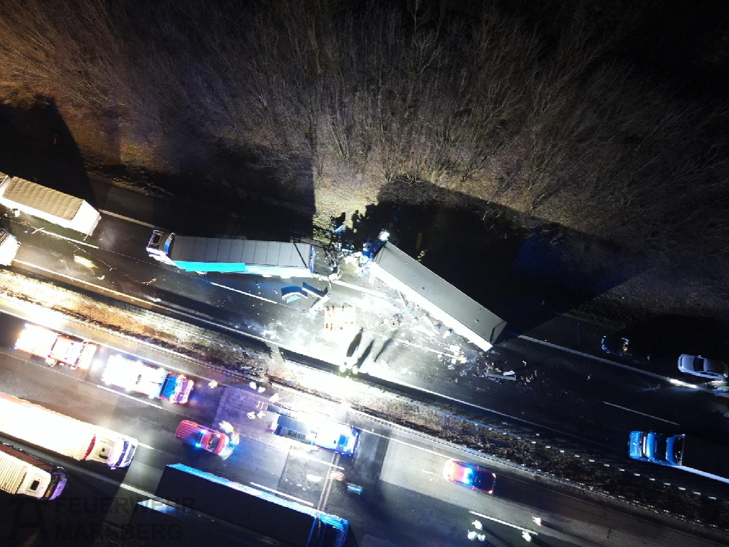 Vermutliches Blitzeis war die Ursache für die Massenkarambolage, die sich auf der A44 zwischen den Anschlussstellen Marsberg und Lichtenau ereignete. Gegen 1.30 Uhr in der Nacht passierte das Unglück, zwei LKW fuhren aufeinander auf, beide Fahrzeuge gerieten in Brand. Dem folgten weitere Unfälle, andere LKW stürzten um oder überschlugen sich. Ein ausgedehntes Trümmerfeld war die Folge. 18 Unfälle waren insgesamt zu verzeichnen.