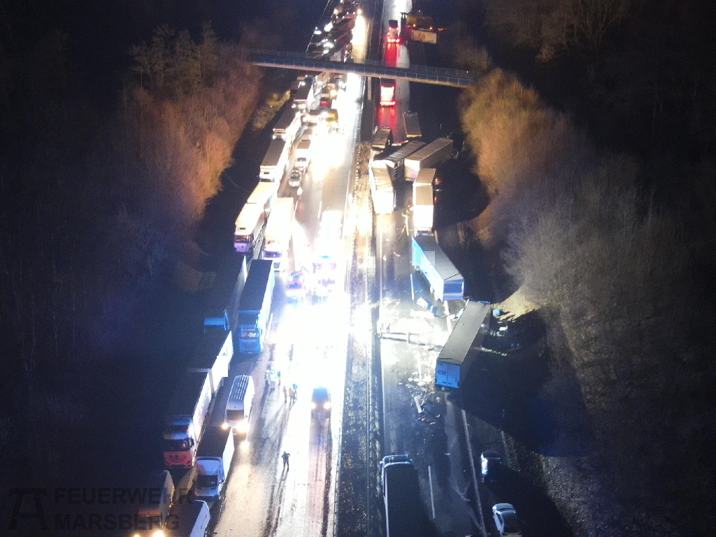 Meerhof/ Scherfede: Eine Massenkarambolage auf der A44 zwischen den Anschlussstellen Marsberg und Lichtenau in beiden Fahrtrichtungen forderte in der Nacht zum 23.1.2026 drei Tote und viele Verletzte. Ein Großaufgebot von Feuerwehr, Polizei, Rettungsdienst und Hilfsorganisationen waren vor Ort. Der Einsatz zog sich über Stunden, die Autobahn blieb bis in den späten Nachmittag gesperrt.