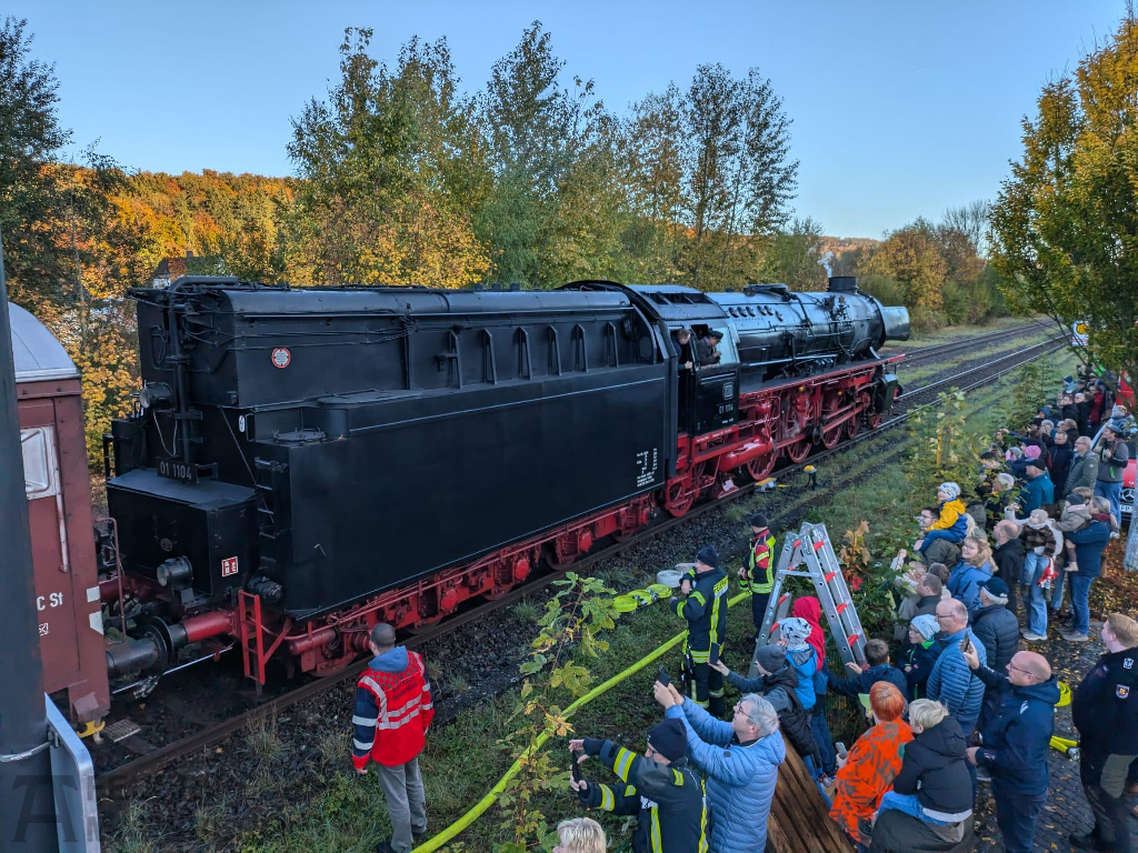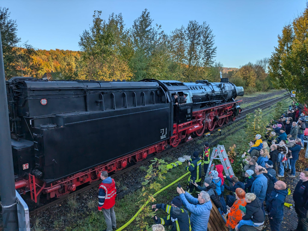 Es galt, die Dampflok eines Sonderzuges mit Wasser zu betanken, damit diese ihre Fahrt über Kassel bis nach Eisenach fortsetzen konnte: Dabei wurden ca. 25 Kubikmeter Wasser in den Tender gefördert.