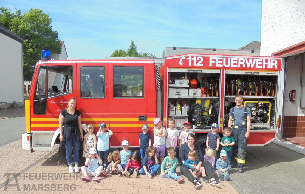 Um den Kindern alles rund um das Thema Feuerwehr zu vermitteln, wurde das Thema durch die Erzieherinnen wochenweise vermittelt. Die Kinder haben alles über die Feuerwehrkleidung und über die Fahrzeuge gelernt, wie die Feuerwehr alarmiert wird und mit welchen Ausrüstungsgegenständen gearbeitet wird. Zum Ende der Themenwoche haben die Kinder ein Vormittag bei der Feuerwehr in Westheim verbringen dürfen. Mit viel Freude und Interesse haben sich die Kinder die Feuerwehrfahrzeuge und das Gerätehaus angeschaut, durften die Einsatzkleidung anprobieren und mit der Kübelspritze ein Feuer löschen.