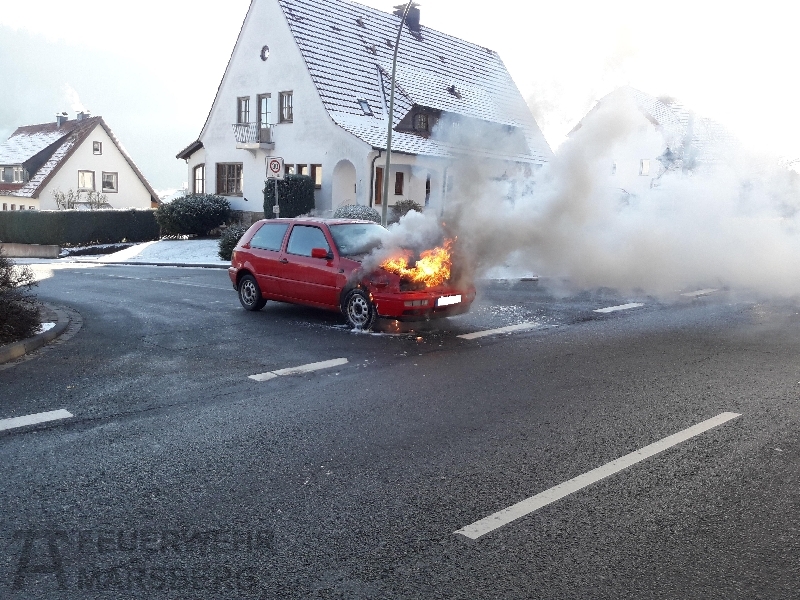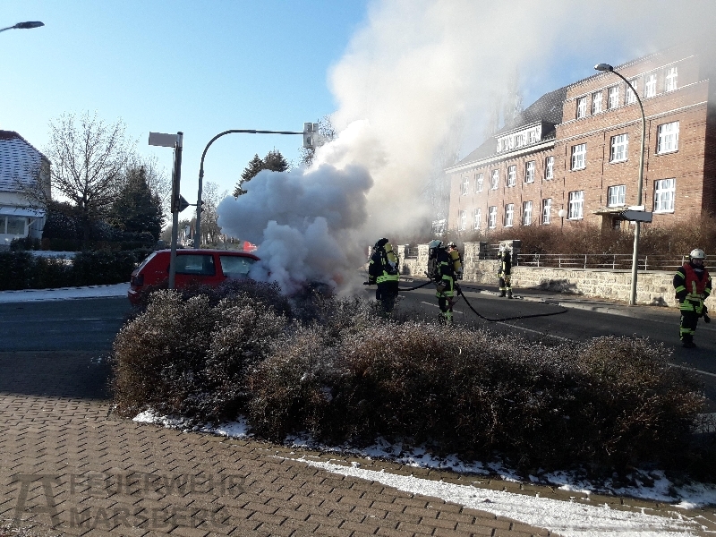 An einer Einmündung zur Bredelarer Straße ist am Sonntag Vormittag ein PKW in Brand geraten. Die beiden Fahrzeuginsassen bemerkten kurz nachdem sie losgefahren waren Qualm aus dem Motorraum. Als sie anhielten um nachzusehen, schlugen bereits Flammen aus dem Radkasten. Die Löschversuche mit einem Feuerlöscher blieben ohne Erfolg.